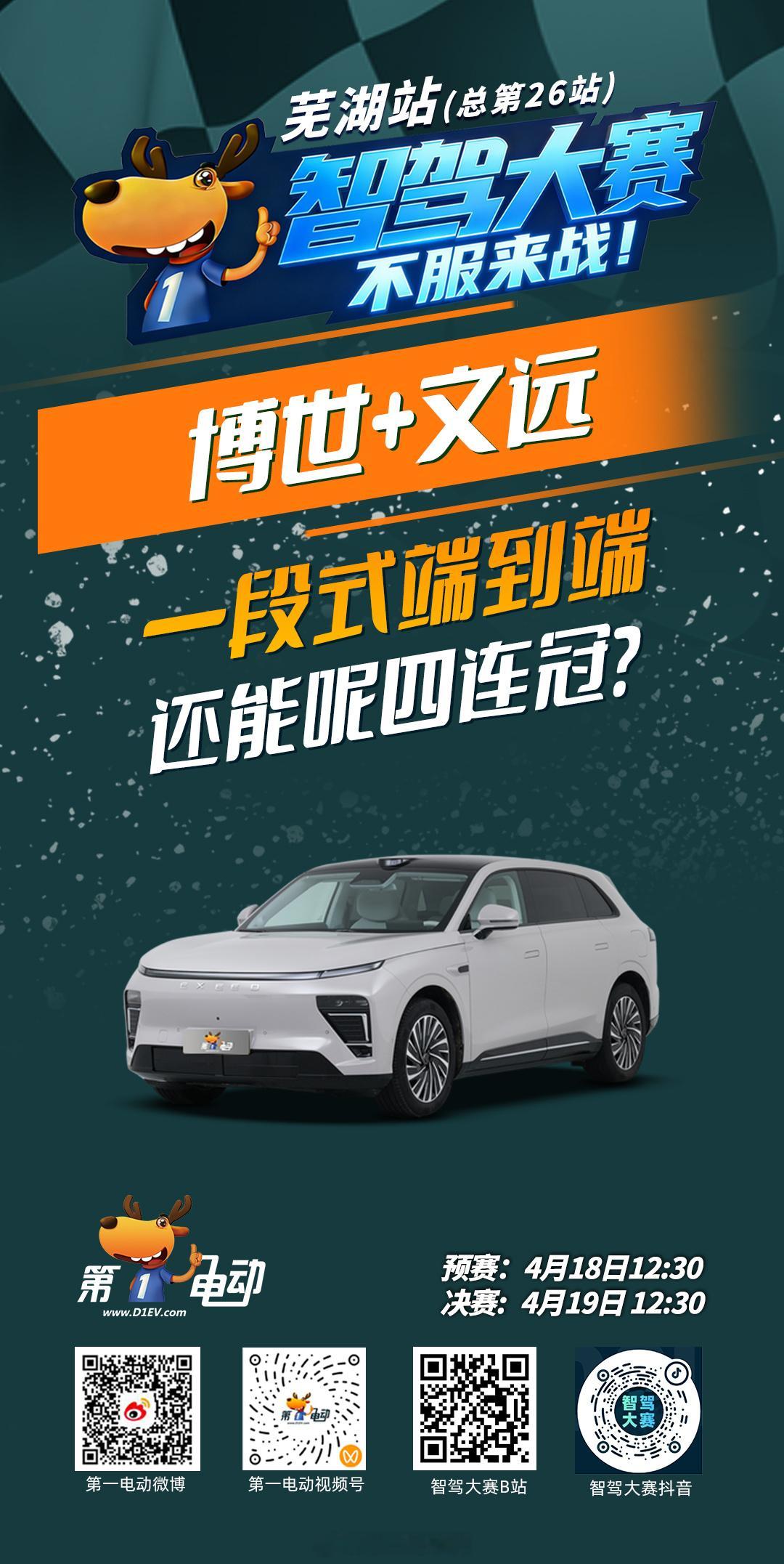 ⏰ 直播锁定:预赛 4月18日 12:30 / 决赛 4月19日 12:30📺 直播平台:第一电动 微博/视频号;智驾大赛 B站/抖音多位大V同步解说,弹幕等你来押注!