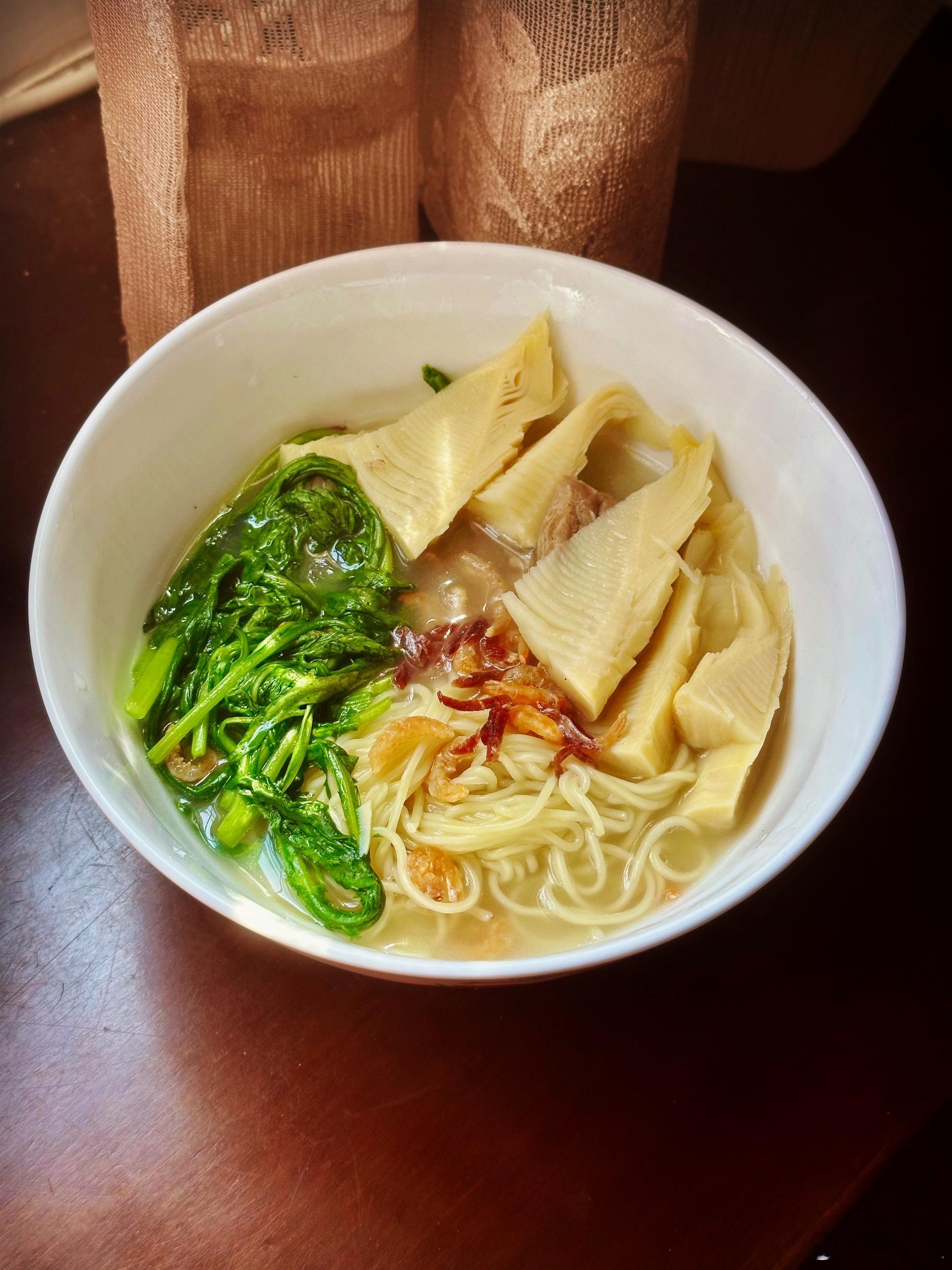 兄弟不在上海,还是差人送来两只黄泥拱。所以说家里要总备好两盒鸡汤,两盒肉汤。所以说家里要总备好开洋火腿南风肉。得了好货,要配得出,接得牢。马上拆一只笋尖。鸡汤开洋火腿笋尖烩面,说端就端出来了。日常顶奢。