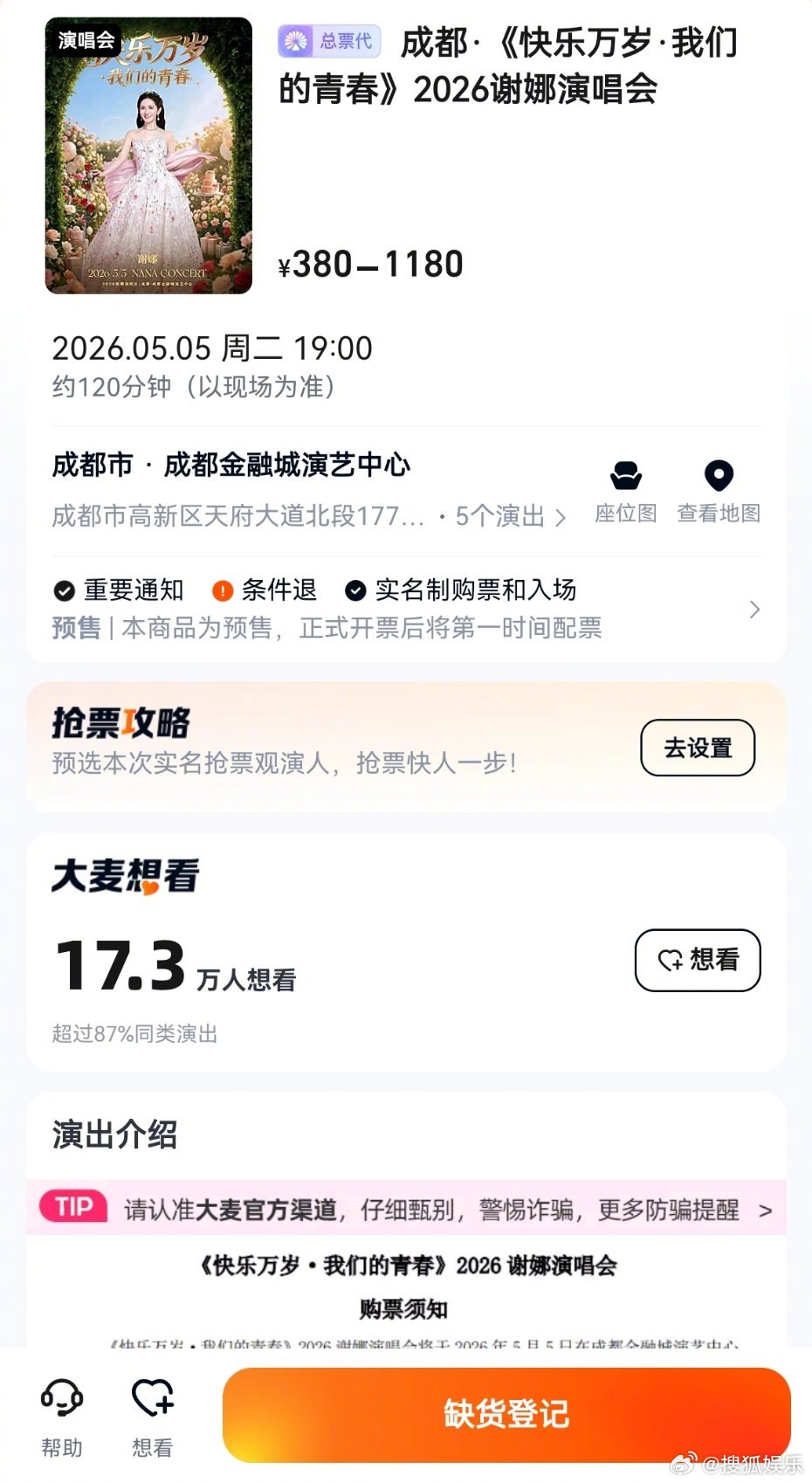 谢娜成都演唱会门票秒售罄 2026【快乐万岁我们的青春】成都演唱会门票秒售罄,娜娜激动到手抖,你有加入激烈的抢票队伍吗?