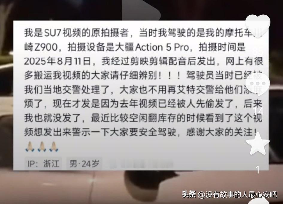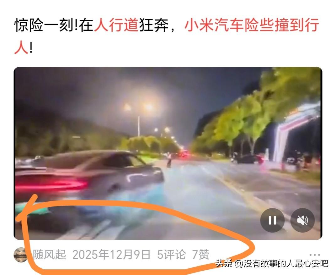 真相大白,小米su7极限避让斑马线行人的视频,是25年的视频,视频拍摄者发声。 网上一段小米su7极限避让斑马线女子的视频火了,看着非常的惊险,高速行驶的小米su7在斑马线没有减速,加速避让一位女子,可以说是擦着女生的腿过去的,把女子吓了一跳,这要是撞上去的话,女子的性命就堪忧了。 后车追上这辆小米su7的驾驶员是一名年轻女子,还在对着车内的乘客笑,丝毫没有意识到刚才的危险性,应该在高兴小米的避让功能比较牛。 但是有细心的网友发现,这个视频是老视频了,在网上可以找到,大概是25年8月11日的视频。 都过去快一年的时间了,视频又发出来,而且还引起了热议,以至于不少网友跑到浙江交警那里去留言。 然后该视频的拍摄者发声,这就是昨年8月11日的视频,最近翻库存的时候找到了,就发出来警示一下大家,视频里的小米车主已经被处理过了。