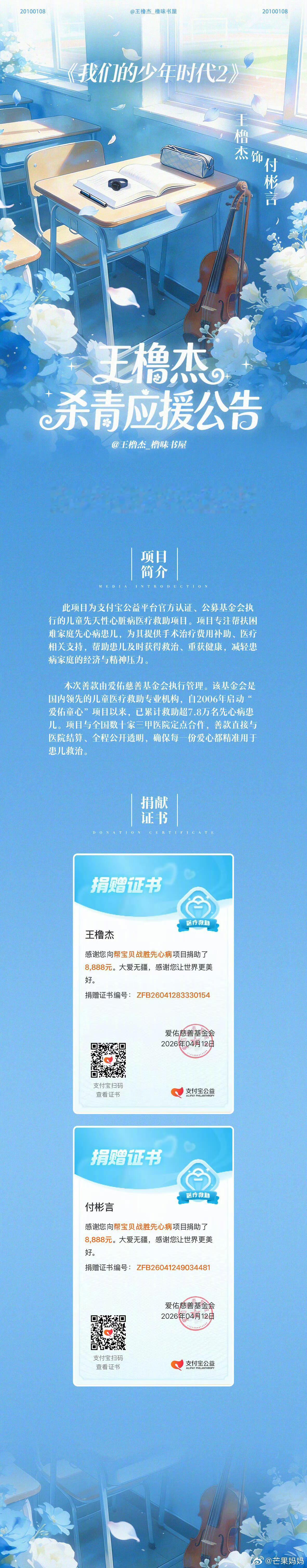 王橹杰粉丝的杀青应援是有关先天性心脏病的公益甚至是王橹杰和他的角色付彬言一人一份…