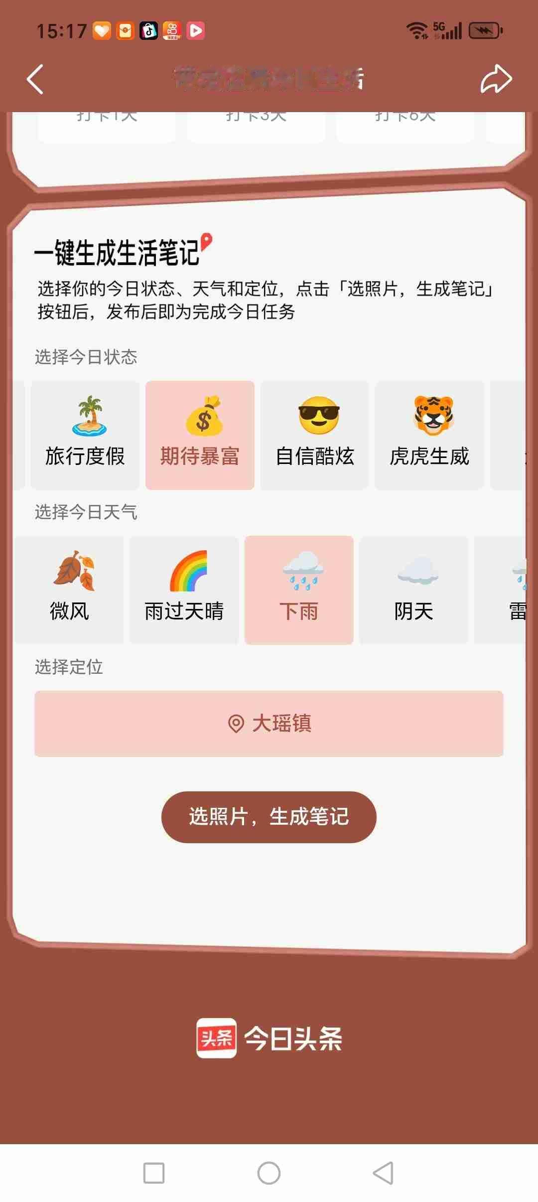 我的今日状态:💰期待暴富 我这里的天气:🌧下雨 今日雨势凶猛,郑重地给状态栏打上了“期待暴富”的标签。 这波操作,主打一个“精神胜利法”。 看着窗外的大雨,我盘算着:如果我现在中个彩票,这雨我都能把它当成财神爷泼水给我洗钱袋子。 生活虽然苦,但做梦必须甜。 没钱去马尔代夫度假,那就在大雨里畅想一下富豪生活。 别问我为什么不努力,努力太辛苦了,我就想走个捷径。 老天爷,看在这雨下得这么真诚的份上,要不……赏口饭吃?砸点钱花?🙏