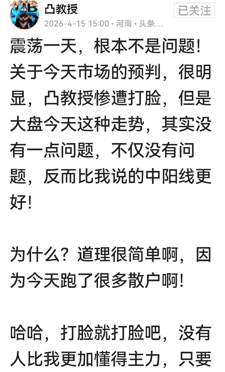 “没有人比我更懂得主力”,这话谁说的?看清楚,白纸黑字,虽然是懂王的话术,但版权是老凸的。[捂脸] 还有,老凸不见主力净流出751亿,说“今天这走势,不仅没有问题,反而比我说的中阳线更好”,因为“跑了很多散户”,如此懂主力,真让人唏嘘。 但昨晚我表示支持老凸,也立了帖,今天脸疼我认账,不耍赖。