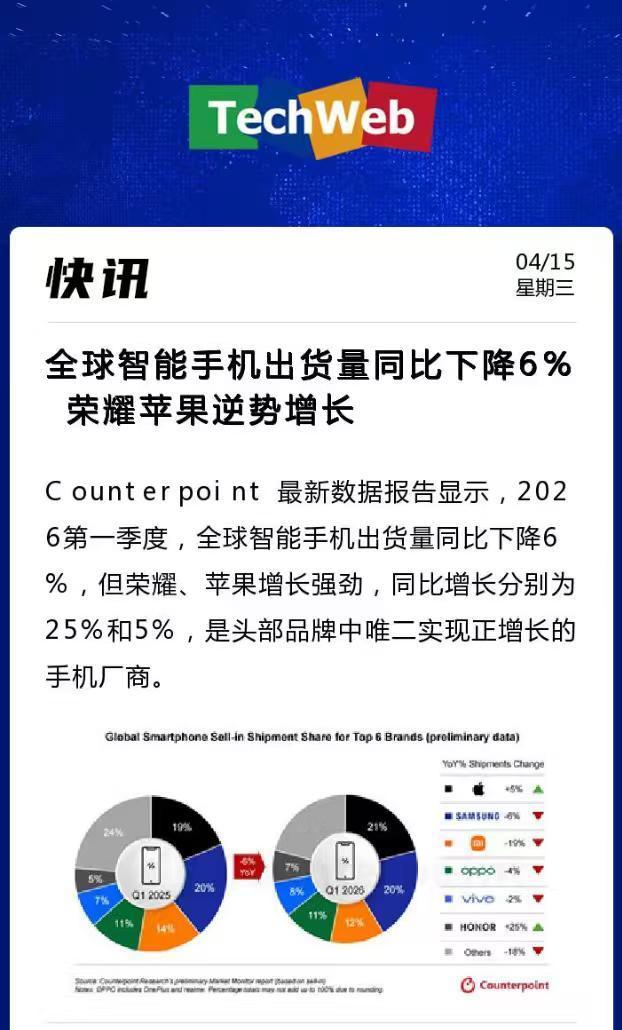 谁能想到,在2026年Q1全球手机市场集体下滑的大背景下,安卓阵营居然只有一个品牌实现了正增长?没错,就是荣耀!Counterpoint数据显示,全球出货量同比降6%,荣耀却逆势大涨25%,和苹果一起成为头部品牌中唯二的增长选手。 对比一下其他安卓厂商的表现:三星跌6%,小米跌19%,OPPO跌4%,vivo跌2%,荣耀这25%的增速显得格外耀眼。而且这不是偶然,荣耀已经实现了连续多个季度的正增长。靠的就是全球化布局、精准的产品定位和超强的执行力。国产手机能在全球市场打出这样的成绩,必须点赞!