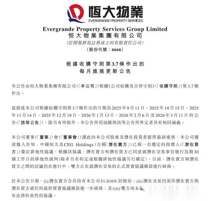 【恒大物业:中国恒大等与一名潜在买方签订排他性协议】4月14日晚间,恒大物业在港交所公告,获清盘人告知,中国恒大及相关持股方,搭上了一个神秘买家,打算关起门来谈上一个多月。 这话等于彻底透了底。 当年老许手里最拿得出手的现金奶牛,如今正式端上了货架,拿来抵债了。 清盘组在这个节骨眼上抛出个独家洽谈期,盘算很明显。底下那群债主早就急红了眼,现在必须给他们稳稳神,证明处置团队还在拼命往外榨油水。顺便也把场地清一清,免得半路冒出别人来搅乱竞价。 但真要吞下这份资产,没那么容易。 往前翻两年就能想起来,合生创展本来打算掏两百多亿港元的真金白银接下这盘子。结果到了临门一脚,硬是让那张乱七八糟的关连财务网给搅黄了。 有这笔前车之鉴摆着,这次买卖能谈成啥样,我确实不看好。 别把事情想得太美。现在肯跑来签意向书的,压根不是来兜底救火的。这帮人盘旋了半天,只盯死一件事:把价格往死里砍。 哪怕最后真按手印了,新买家最怕的也是那深不见底的暗账。他们非得把这块资产跟原来的恒大烂摊子剥离得干干净净,建起严密的隔离墙,才会松口付一分钱。这哪算什么企业自救,就是一场带血的甩卖。 曾经风光无限的集团王牌,现在只能任人砍价。 对此,你怎么看?