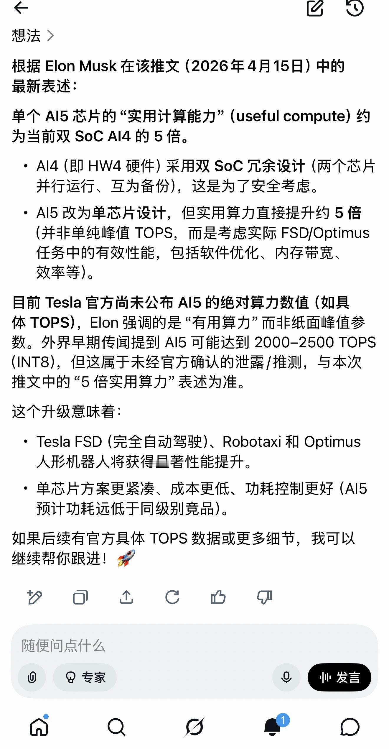 马斯克:AI5的算力是双Soc AI4的5倍,那是多少有效算力呢?问了Gork,没有正面回答。