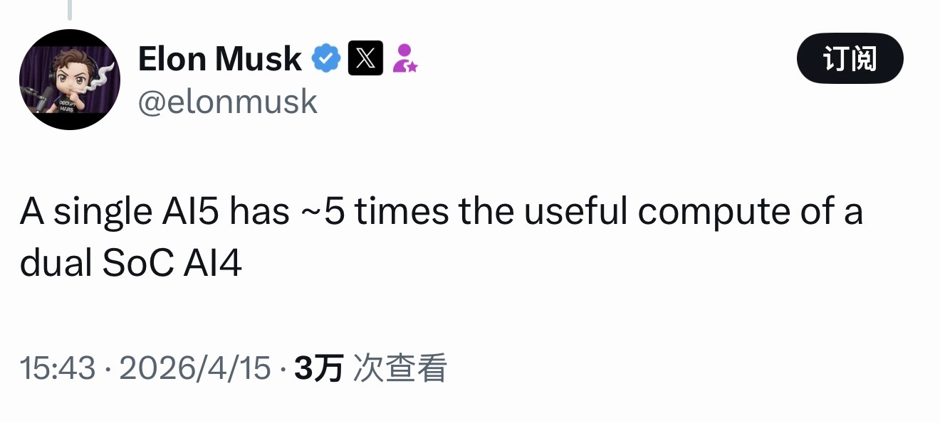 马斯克:AI5的算力是双SocAI4的5倍,那是多少有效算力呢?问了Gork,