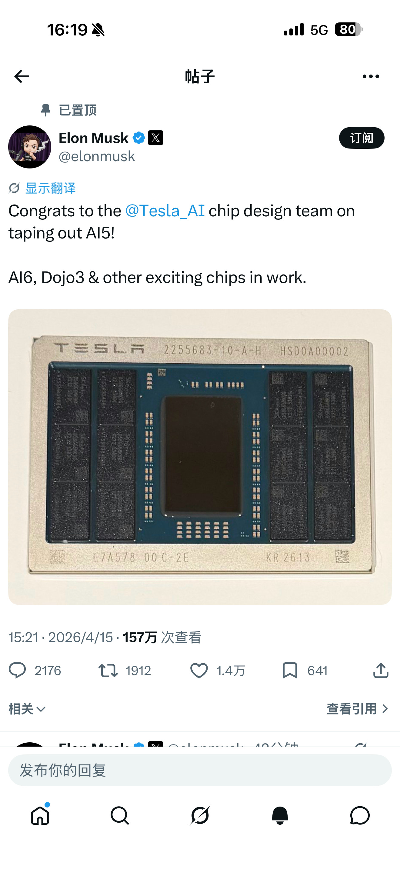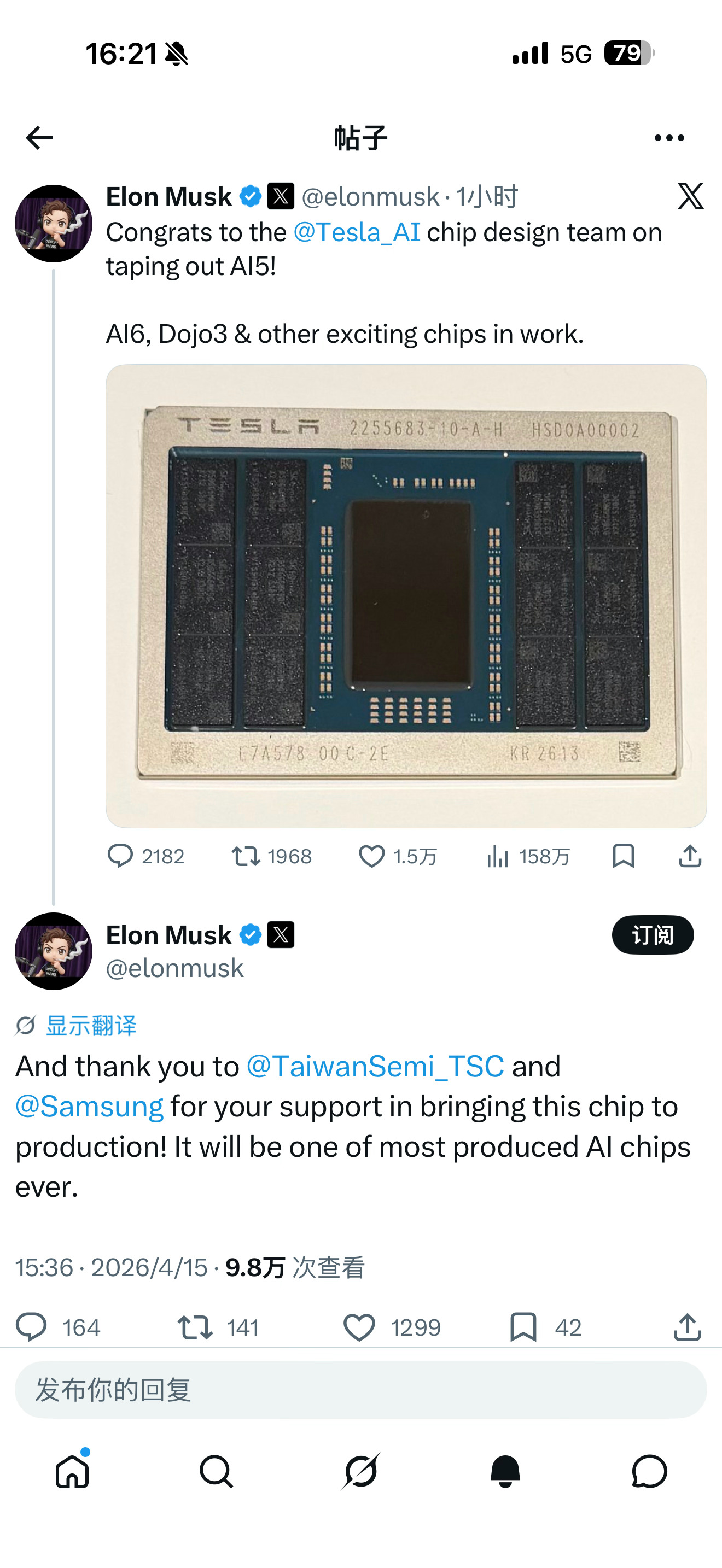 特斯拉AI5 流片成功,老马感谢了三星和TSC(不是台积电)。