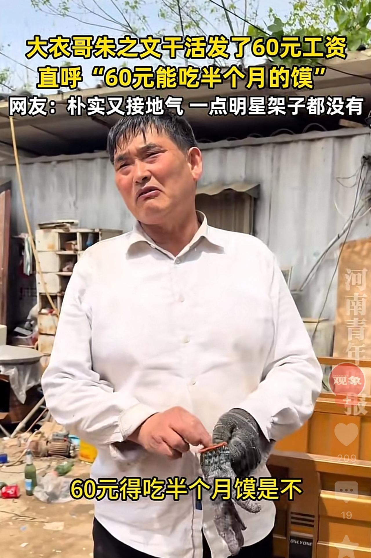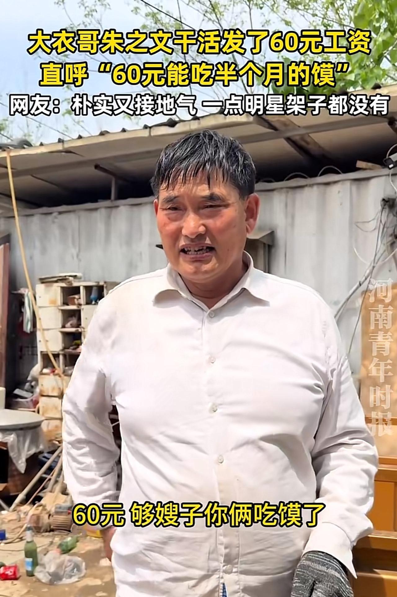 在所有的草根明星里边,大衣哥真的是没有飘,非常非常接地气。 视频里,大衣哥干完活拿到60元工资,手里攥着钱,笑着说:“60元能吃半个月的馍” 没有一点明星架子,穿着洗得发白的白衬衫,手上还戴着干活的手套,站在自家院子里,语气朴实得像个普通农民。 以他现在的身家,去城里买个别墅,过上养尊处优的生活完全不是问题。但是他一直扎根农村在农村,没有住豪宅,开豪车。依旧干着农活,过着最朴素的日子。 从他给儿女选择对象来看,也非常的朴实。都是普通的家庭,普通的孩子,就是奔着一起过日子去的。 60元,在很多人眼里可能连一杯奶茶都不够,可在大衣哥眼里,是能吃半个月馍的踏实。这份对生活的敬畏,对金钱的平常心,才是最难得的。 真正的强大,从来不是腰缠万贯、高高在上,而是无论走多远,都记得来时的路,守得住本心,放得下架子。