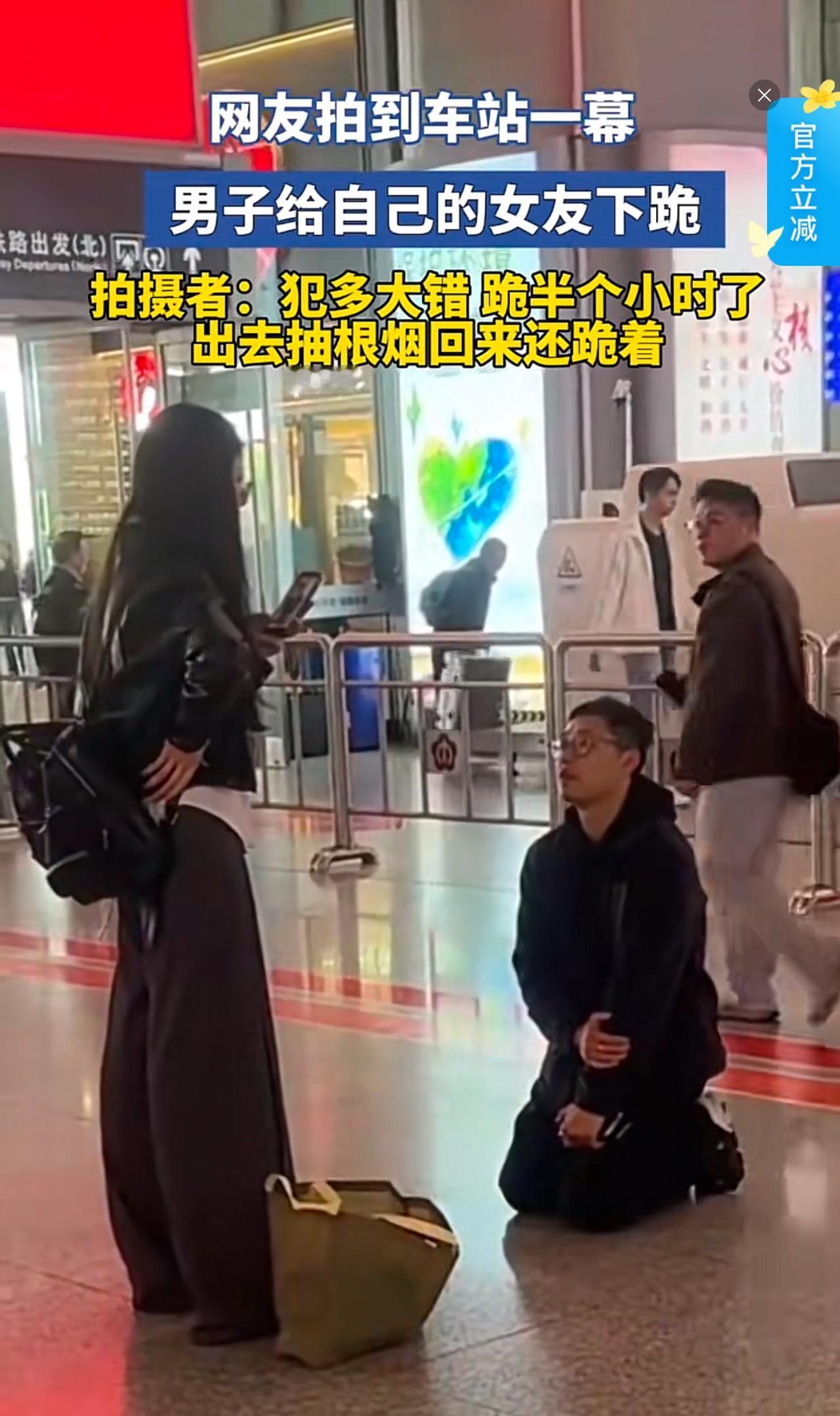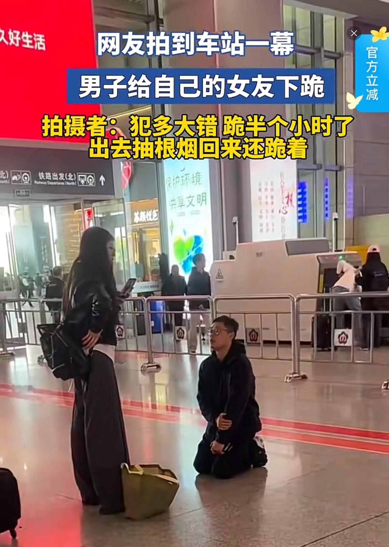 车站人来人往,男子给女友下跪道歉,一跪就是半小时。这一幕看似是男子深情悔过,实则是感情里最畸形的相处状态。这样的男人不能嫁,这样的女人不能娶。 感情的基础是平等尊重,可这对情侣的相处模式完全跑偏。女友让男友当众下跪,是用践踏对方尊严的方式确认掌控权,是隐形的PUA;男子毫无底线的顺从,把自己的尊严踩碎在大庭广众之下,看似是爱,实则是对感情的彻底妥协。 当众下跪不仅丢尽了两人的体面,更给旁人做了最差示范:感情不是并肩同行,而是一方臣服、一方凌驾。真正的道歉从来不需要自轻自贱,合理沟通、真诚弥补才是相处之道。 好的感情从不需要跪舔,别用卑微换包容,也别用羞辱换顺从,丢掉底线的感情,终究走不远。 总有一些蠢笨的人,通过贬低另一半的尊严,来彰显自己的幸福。我见过几个这样的。有一个说,我打我老公的时候,把他抓的满脸花,他屁都不敢放一个。还有一个说,我不允许我老公身上带钱,一个月500零花钱得报备。 这种女人总是通过贬低对一方彰显自己的地位。好像对方毫无原则的妥协,是对自己深深的爱。其实另一半只是基于自身条件不敢反抗而已。但凡他有了钱,但凡他有能力换一个老婆,他为什么要忍受呢?哪里有那么多的受虐体。 无论男人还是女人,聪明的人都是在外互相给面子。一件衣服里子破了,表子也烂了,不是该扔垃圾桶了吗?