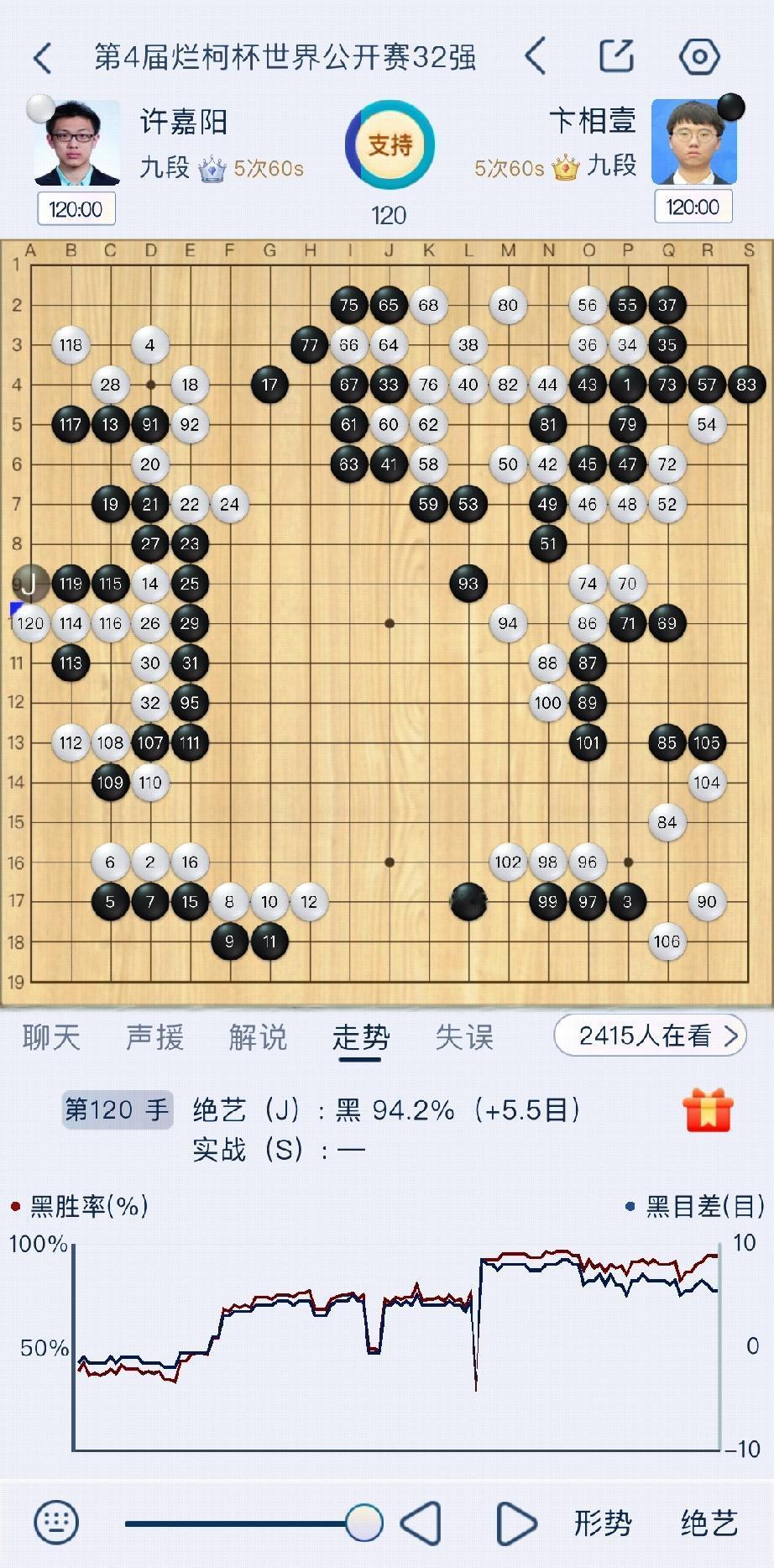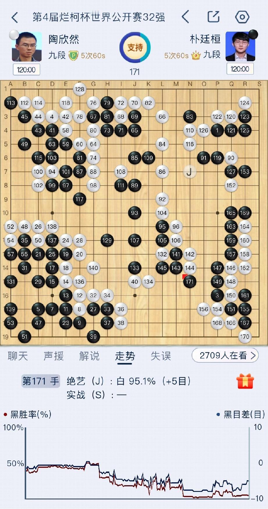 韩国三强局面“二优一劣”! 4月15日,第四届“烂柯杯”世界围棋公开赛1/16决赛。 陶欣然对阵朴廷桓,弈至171手陶欣然局面占优;谢科对阵申真谞和徐嘉阳对阵卞相壹这两盘棋,韩国棋手局面占优。