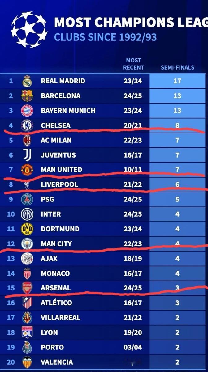92-93赛季以来,杀进欧冠半决赛最多的英超球队是切尔西,这你敢信吗? 英超球队杀入欧冠半决赛排名: 切尔西 8次 曼联 7次 利物浦 6次 曼城 4次 阿森纳 3次 皇马、巴萨、拜仁、切尔西,欧冠所谓的“萨马蓝其”果然不是白说说的。而切尔西之所以有如此成就,一大半功劳要记在那位俄罗斯大亨身上。现在我车球迷应该非常怀念他在位的那个时候吧,可好像回不去了!!![捂脸][捂脸][捂脸]