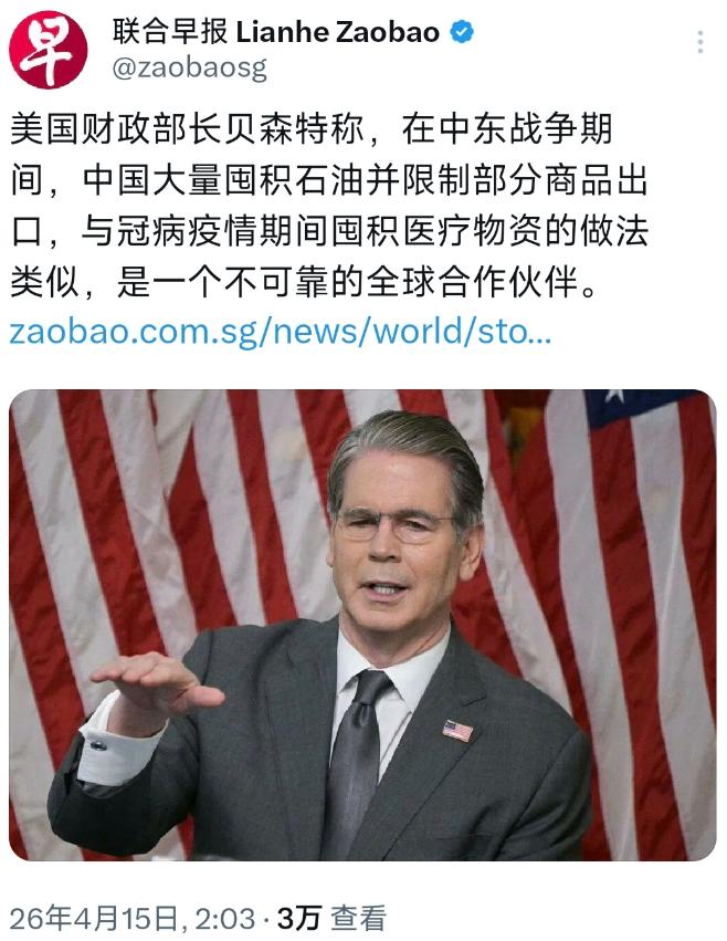 美国财长突然“开喷”中国! 联合早报消息,贝森特直指中国中东战争期间 “囤石油、限出口”,堪比疫情 “囤医疗物资”,骂中国是 “不可靠伙伴”! 但撕开真相才懂,全球动荡的真凶根本另有其人。 在国际舆论场,美国政客的抹黑话术总是有着惊人的相似性,先抛出一个毫无根据的指控,再用双重标准包装成 “正义表达”,贝森特的这番言论不过是新瓶装旧酒。 所谓中国 “囤积石油”,本质上是对国家能源安全的合理布局,更是全球主要经济体的常规操作。根据公开数据,中国的石油总储备量(含战略与商业储备)可覆盖 110 至 180 天消费需求,这一水平不仅符合国际能源署的安全标准,更建立在多元进口体系之上。 中国仅 40% 原油经霍尔木兹海峡运输,通过中俄、中哈、中缅三大陆路管道,已将陆路输油占比提升至 30%,进口来源扩展到 49 个国家,这样的布局是为了对冲地缘风险,而非所谓的 “囤积”。 反观美国,自身的石油操作才是真正的 “囤积示范”。 2022 年俄乌冲突爆发后,美国为抑制国内油价暴涨,一次性释放了 1.8 亿桶战略石油储备,导致其储备量降至 40 年来最低,较峰值减少近 50%。 而当 2023 年下半年国际油价回落至每桶 79 美元以下时,美国便开始大规模增持储备,这种 “低价抄底、高价抛售” 的操作,完全是将全球能源市场当作自家后花园。 更讽刺的是,美国一边指责中国储备石油,一边自己的战略石油储备仅能覆盖约 40 天需求,却对他国的合理安全布局说三道四,这种双重标准早已成为国际社会的笑柄。 所谓中国 “限制部分商品出口”,更是对中国出口管制政策的刻意曲解。 中国 2024 年实施的《两用物项出口管制条例》,明确管制的是可能用于军事或防扩散的物项,目的是履行国际义务、维护全球安全,管制清单仅 700 项左右,远少于主要国家和地区。 这种基于规则的管制,与美国动辄以 “国家安全” 为由,对芯片、高科技产品实施单边制裁的做法有着本质区别。 美国近年来实施的制裁数量较 20 年前增长了 10 倍,仅上一届政府就发起 3800 项制裁,平均每天 3 次挥舞制裁大棒,这种将经贸问题武器化的行为,才是破坏全球产业链供应链稳定的真正元凶。 至于疫情期间 “囤积医疗物资” 的说法,更是与事实完全相悖。在全球抗疫最艰难的时刻,中国在自身产能有限、需求巨大的情况下,向 150 多个国家和 13 个国际组织提供了抗疫物资援助,累计供应 2800 多亿只口罩、34 亿多件防护服、40 多亿份检测试剂盒,还向 80 多个发展中国家提供疫苗援助。 而当时的美国,不仅囤积了远超自身需求的疫苗,限制疫苗出口,还多次截留其他国家采购的医疗物资,这种自私自利的行为,才是对全球抗疫合作的最大破坏。 美国之所以频频抛出这类抹黑言论,本质上是无法接受中国的发展,试图通过舆论战遏制中国。回顾近年来的全球动荡,从中东战争的持续升级,到全球能源市场的剧烈波动,再到产业链供应链的断裂,背后几乎都能看到美国的身影。 美国凭借军事霸权在中东频繁干预,导致地区局势持续紧张;通过单边制裁和贸易保护主义,破坏全球经济秩序;将能源、科技作为地缘政治工具,动辄对他国极限施压。 真正的不可靠合作伙伴,从来不是那些坚持多边主义、履行国际义务的国家,而是那些将自身利益凌驾于全球利益之上,动辄制造分裂、挑起冲突的势力。 中国的石油储备是为了能源安全,出口管制是为了防扩散,疫情援助是为了全球抗疫,每一项举措都经得起历史和国际社会的检验。 美国与其将精力放在抹黑中国上,不如反思自身的霸权行径。全球需要的是合作共赢,而不是零和博弈;需要的是规则平等,而不是双重标准;需要的是稳定发展,而不是动荡冲突。 当美国真正放下霸权思维,停止制造分裂和动荡,全球治理体系才能更加公正合理,世界才能真正实现和平与繁荣。
