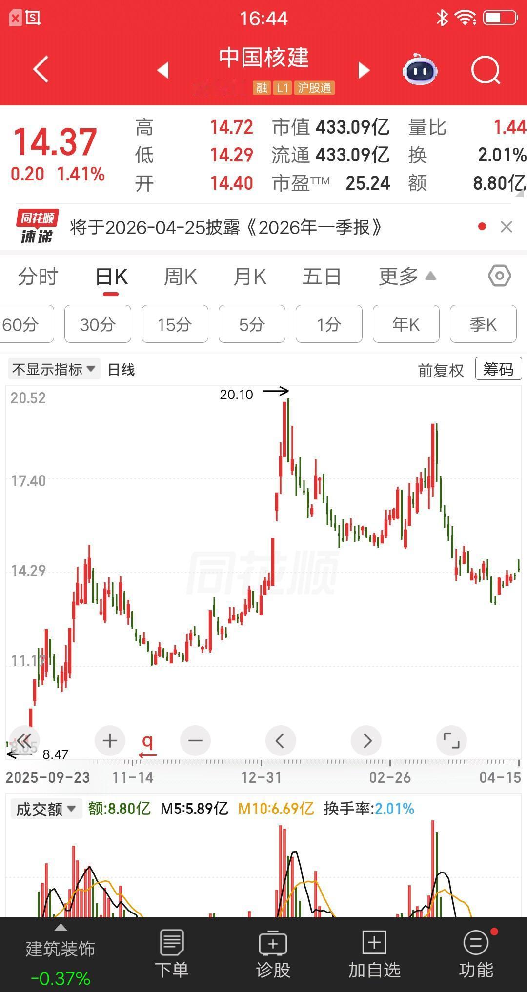 一位广东的股民,10.71元买入中国核建,买完以后股价大涨两天,在12.37元卖出,赚了4万多块。当时市场炒作可控核聚变概念,中国核建也被爆炒。 他买完以后股价继续走高,又在13.28元追进去,这次运气也不差,隔日冲高8个多点,14.43元止盈出局,赚了9000多块。 人在赚钱的时候,是最容易忽视风险的时候。两次成功的交易,让他非常得意。他觉得这样隔日就卖,赚不了几个钱。 后面中国核建两连板,他在第三天追进去,成本18.56元这次要坚定持股了。让他没有想到的是,股价开始调整了,账户浮亏十多个点。他并没有因此慌张,反而认为是主力洗盘。后面股价反弹到19.21元,印证了他的判断,于是继续持股等主升浪。 他做梦都没想到,错过了唯一的回本机会,此后股价持续下跌,他浮亏了20多个点。拿了三个多月,他的耐心磨平了,意识到可能被套了。 他现在后悔莫及,不知道该怎么办了?