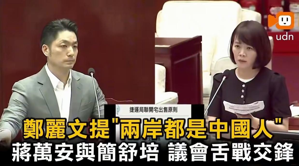 台北市绿营议员简舒培质询台北市长蒋万安:“郑丽文的两岸立场可以代表2300万台湾人吗?”蒋回应:“那赖清德的两岸立场可以代表所有台湾人的立场吗?” 绿娃简舒培这回碰了一鼻子灰,为了所谓“抗中保台”,凡是跟大陆走得近一点的人,与大陆有关联的事她们都会鸡蛋里挑骨头。如果郑丽文不能代表2300万台湾人,民进党赖清德政府也就40%的民意基础,肯定也代表不了台湾2300万同胞。