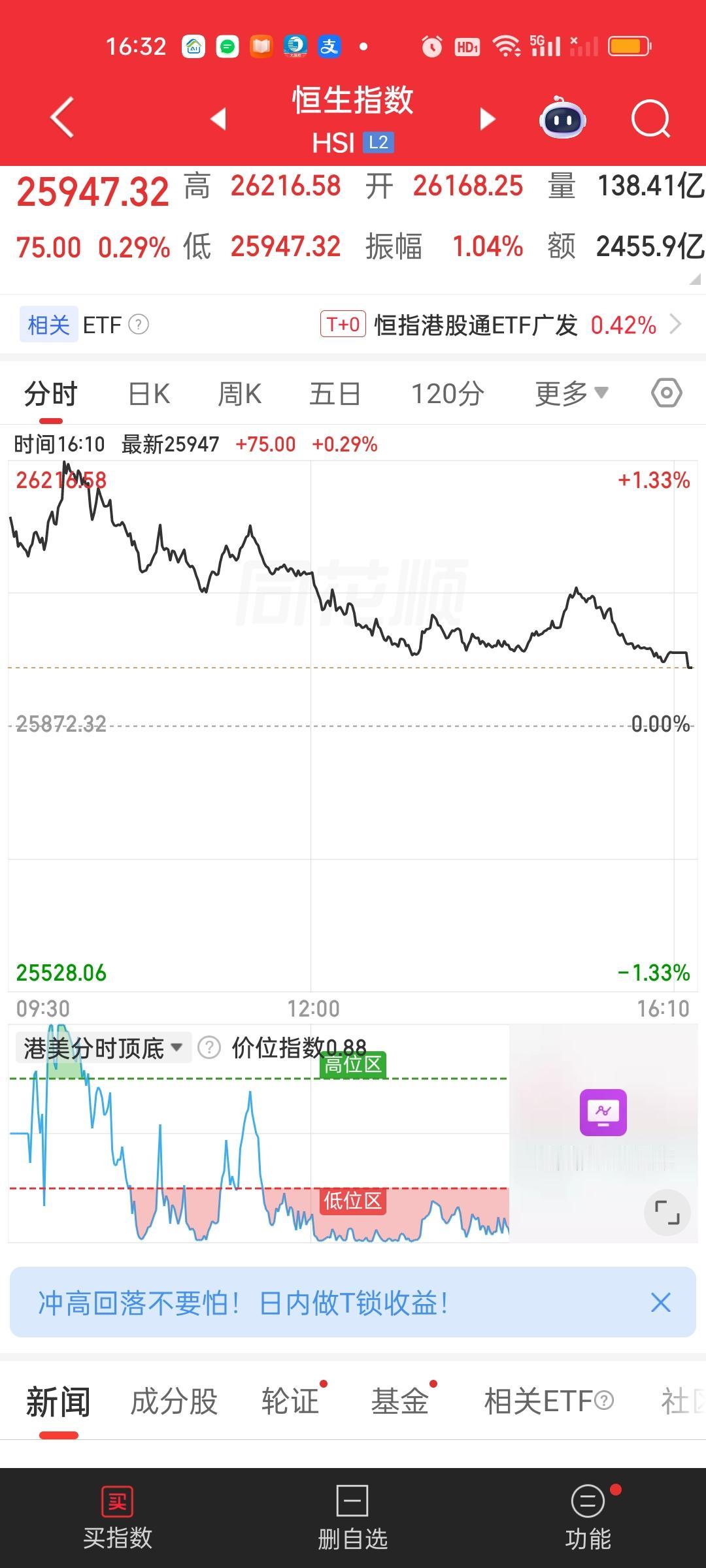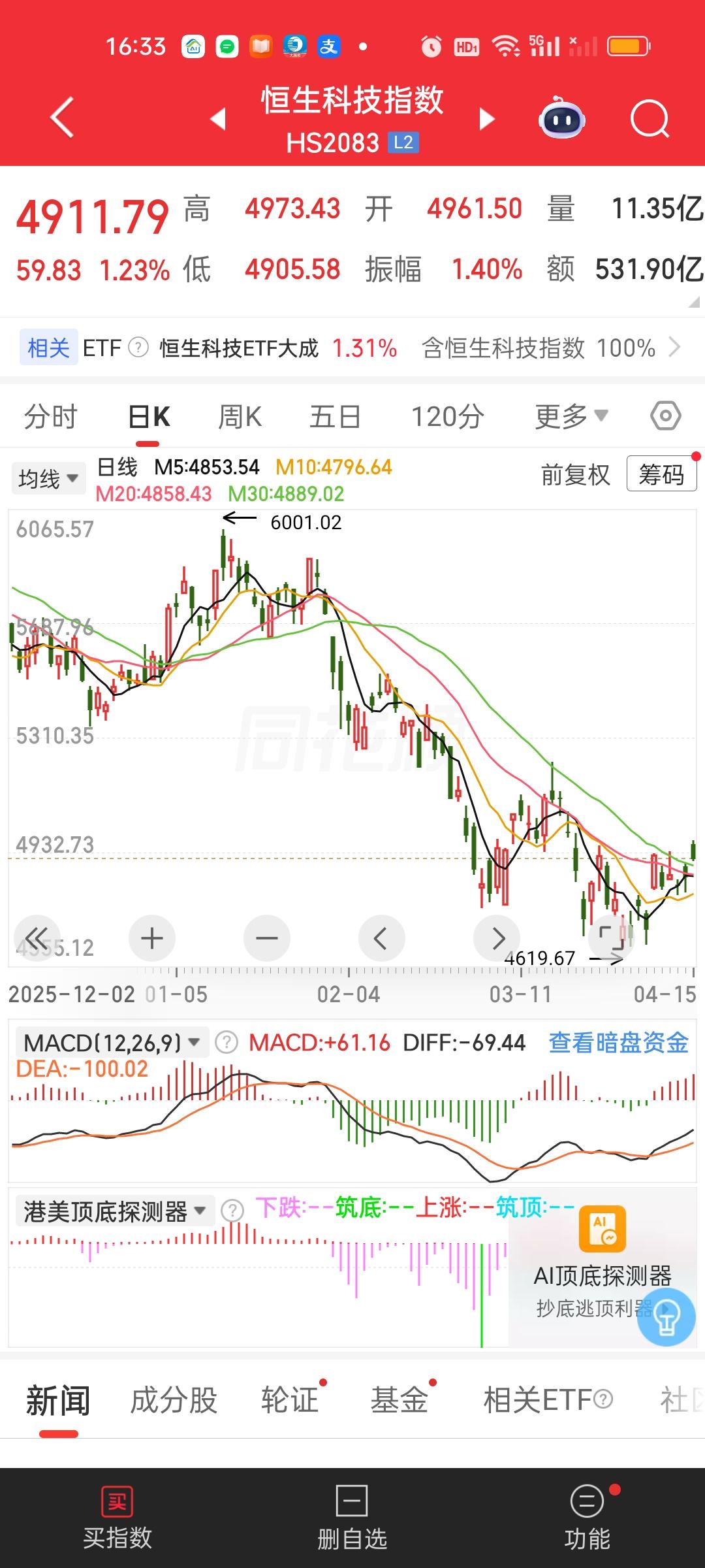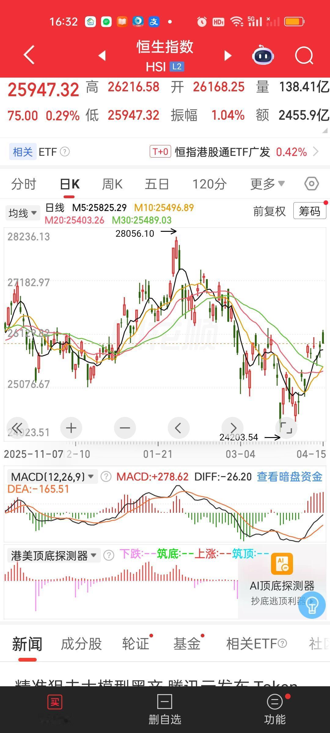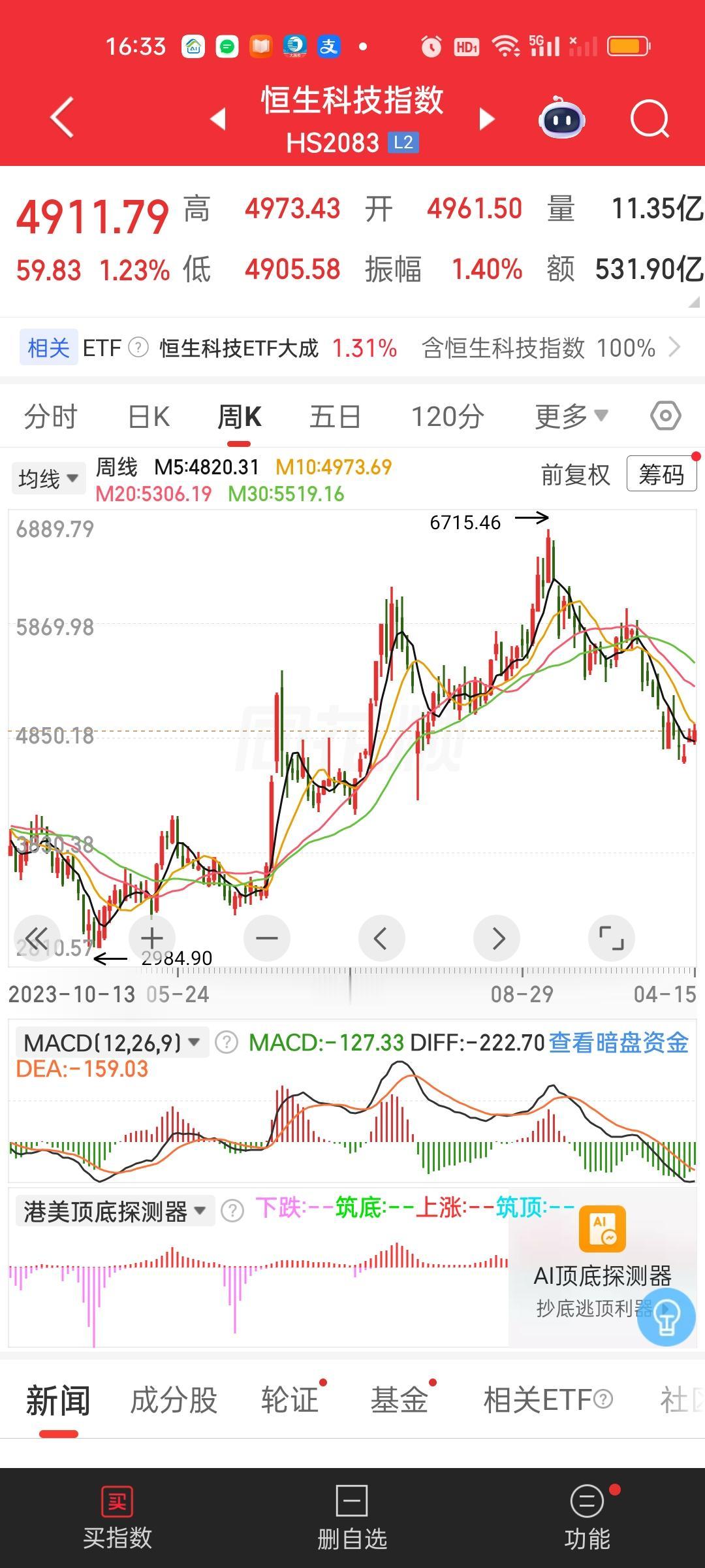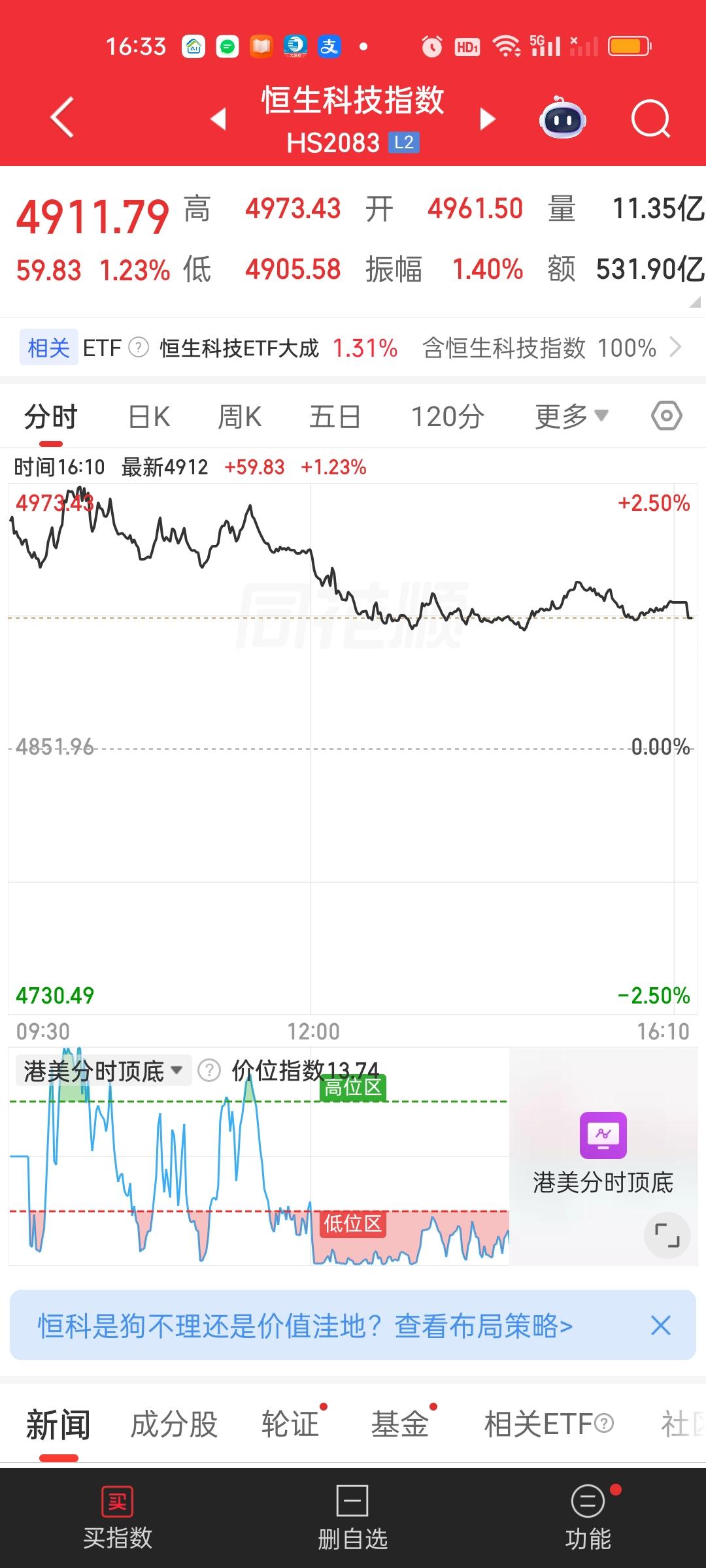 港股收盘了,两大指数今天都是冲高回落的走势。恒指收盘收在了日内最低点,恒科尽管没有收在最低,但离最低点也只有一步之遥。好在两大指数依旧稳稳收在了全部均线的上方。从形态来讲,今天尽管从K线形态来看收的是一根阴线。但真实情况是两大指数都是收涨的,恒科收盘的涨幅还在1.2%以上。只能算涨幅收窄不能算太差。总之上涨趋势并没有破坏,稳稳拿住就行!