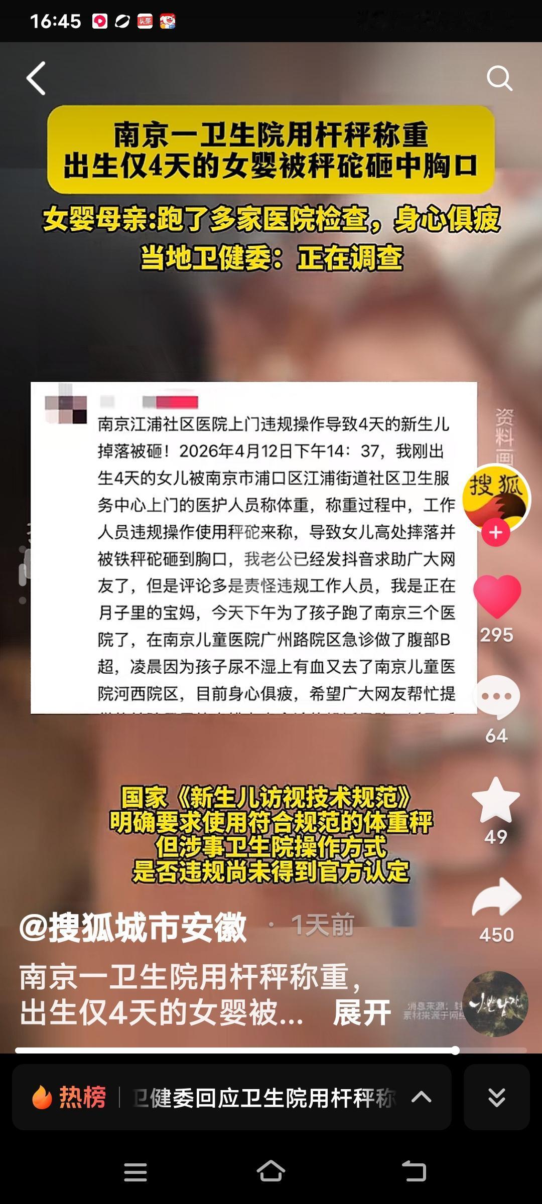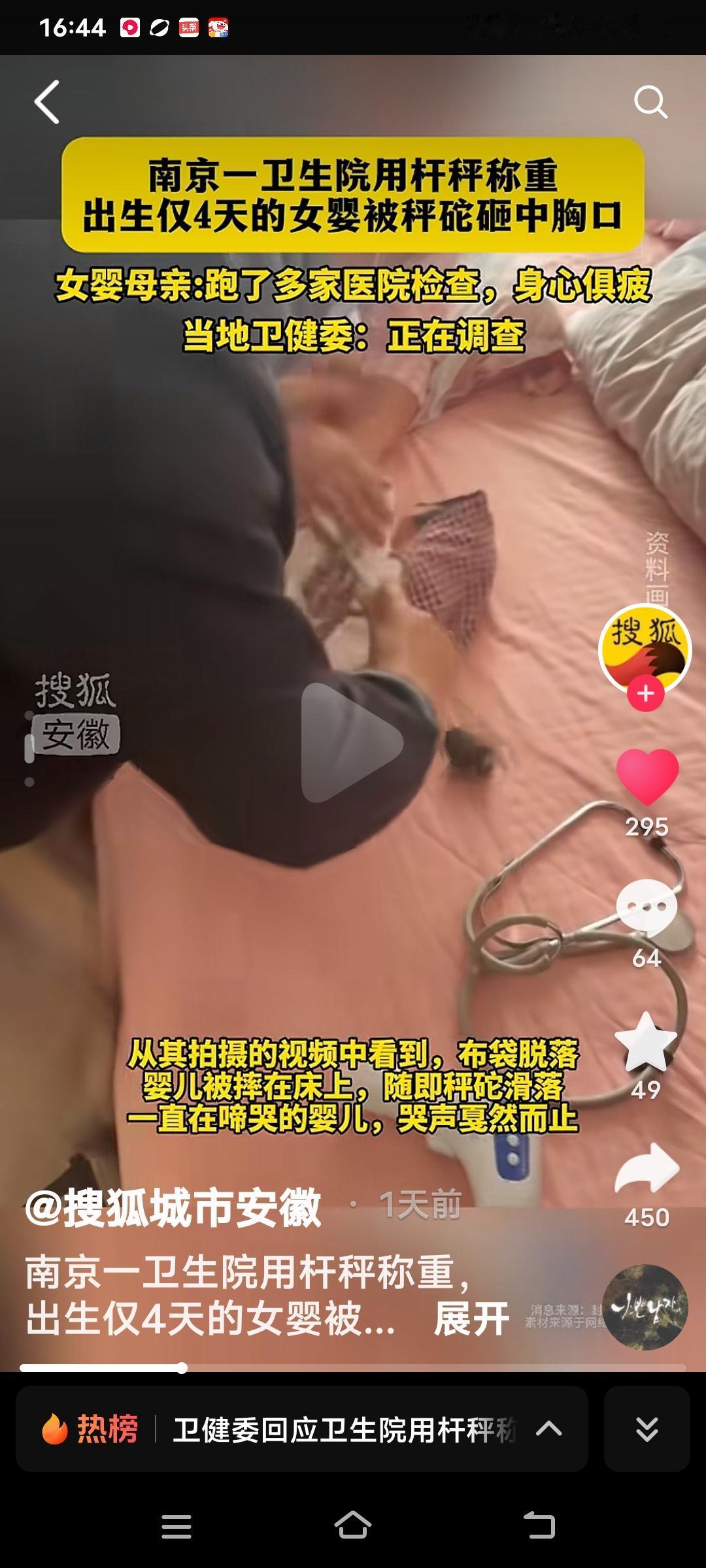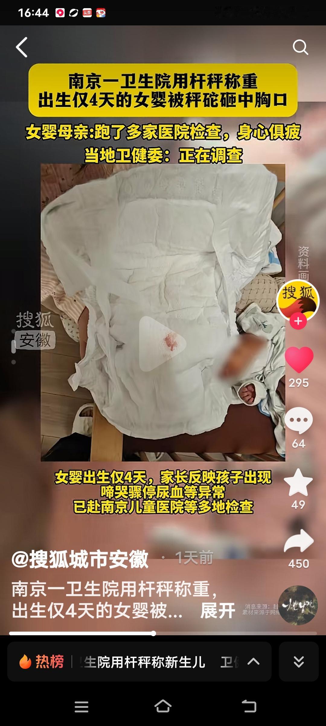 4月12日下午,南京浦口区某社区卫生院内,工作人员使用老式秤为一名出生仅4天的女婴称体重。他们用布将宝宝包裹后挂在秤钩上,不料布兜松动,宝宝摔落在床上,秤砣滑落砸中其胸口,宝宝瞬间没了声响。 次日,宝妈带着宝宝辗转3家医院做B超检查内脏。半夜发现尿不湿有血,又急忙赶往儿童医院,一家人身心俱疲。按照国家规范,新生儿称重应使用卧位电子秤或杠杆体重秤,严禁悬空挂着称重,此次操作明显违规。目前,涉事医护已被停职,卫健部门也已介入调查。 真心希望医护人员都能重视安全问题,莫让无辜的宝宝遭受这般痛苦。 话说回来,如今哪还有用秤称新生儿体重的呢?这些工作人员真是自找麻烦。这可是才出生四天的孩子啊,只愿孩子能平安无事。 新生儿标准体重 2个月婴儿体重 孕期估重 儿科婴儿秤