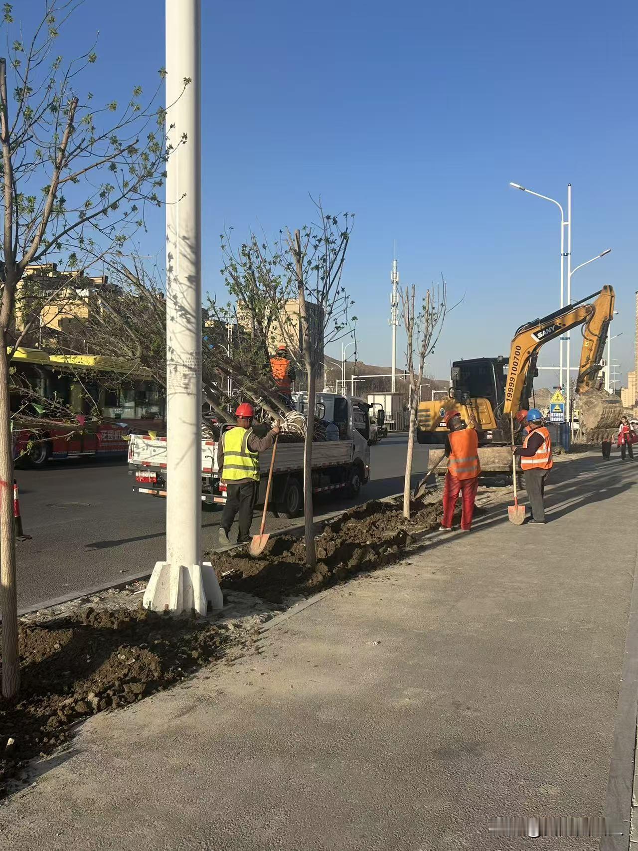 西泉街上,工人们正在补种树苗,去年因为水源问题无法及时跟上,死了不少树苗,这次进行更换,并补种,水源问题施工方也准备引入旁边水库的水源。