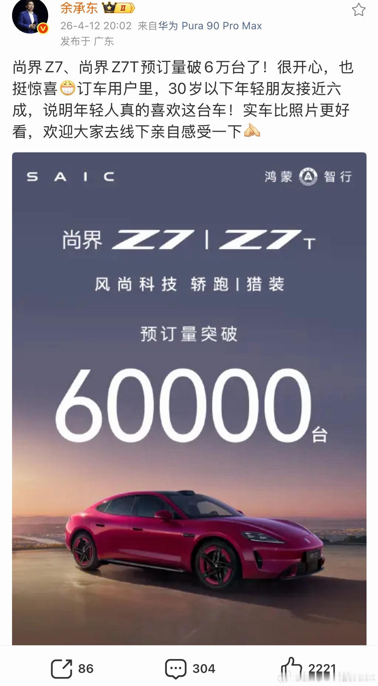 鸿蒙智行春季发布会官宣尚界Z7以及尚界Z7T两款车将在4月22日正式上市,大家都很关注这款车的各方面细节以及最后的定价,目前官方披露的预订量已经破6万,其中接近六成预订用户来自30岁以下的年轻人,最近下班或者周末有空的可以去线下门店看看展车,顺便蹲一波上市发布会尚界Z7官宣4月22日正式上市