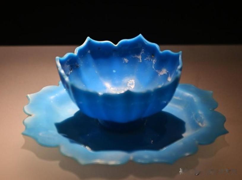 最完整的元代玻璃托盏!甘肃省博物馆的国宝级文物——元代莲花形玻璃托盏。出土于元代陇右王汪世显家族墓地,为国家一级文物甲类。其尺寸精巧,盏高4.9厘米、口径8.9厘米,托高1.2厘米、口径15.2厘米,以半透明普蓝色玻璃制成。