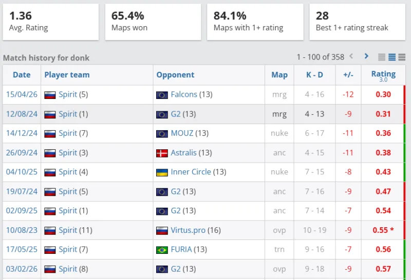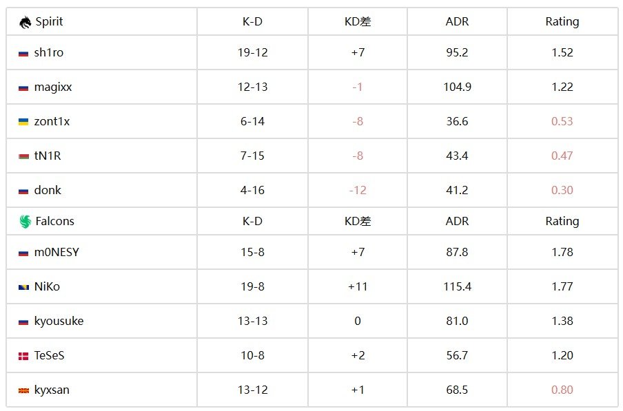 想念大超的第N天...在IEM里约Spirit对阵Falcons的比赛中,donk打出了个人职业生涯单图最差Rating,他仅拿到0.30 Rating。