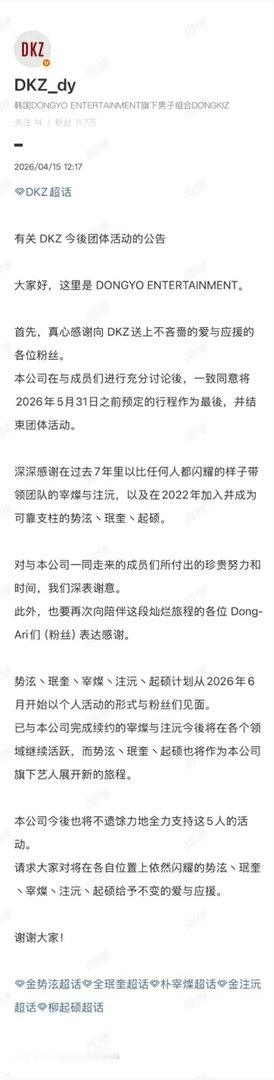 DKZ官宣解散朴宰灿组合将活动到5月31日为止并解散进行个人活动。