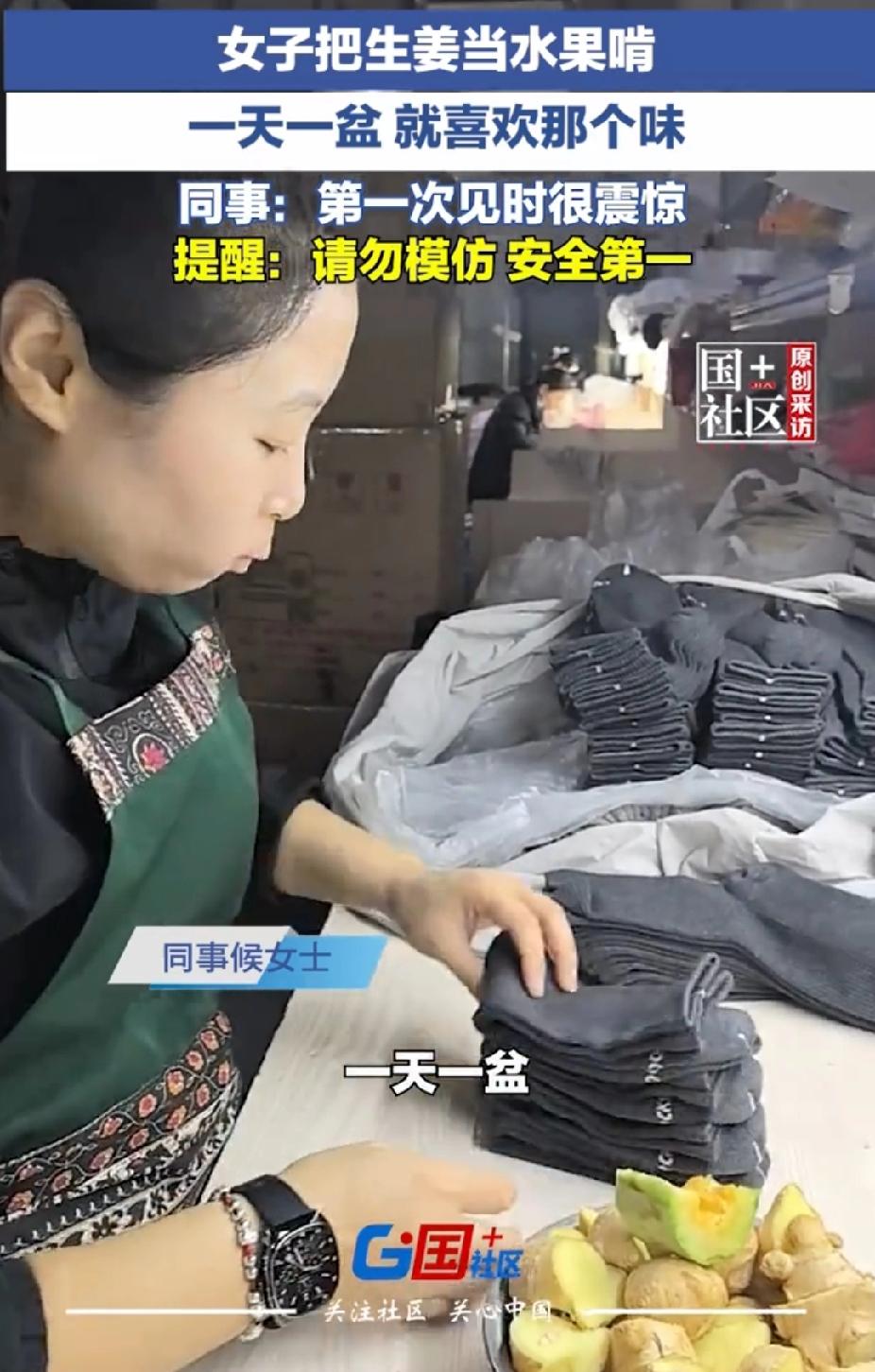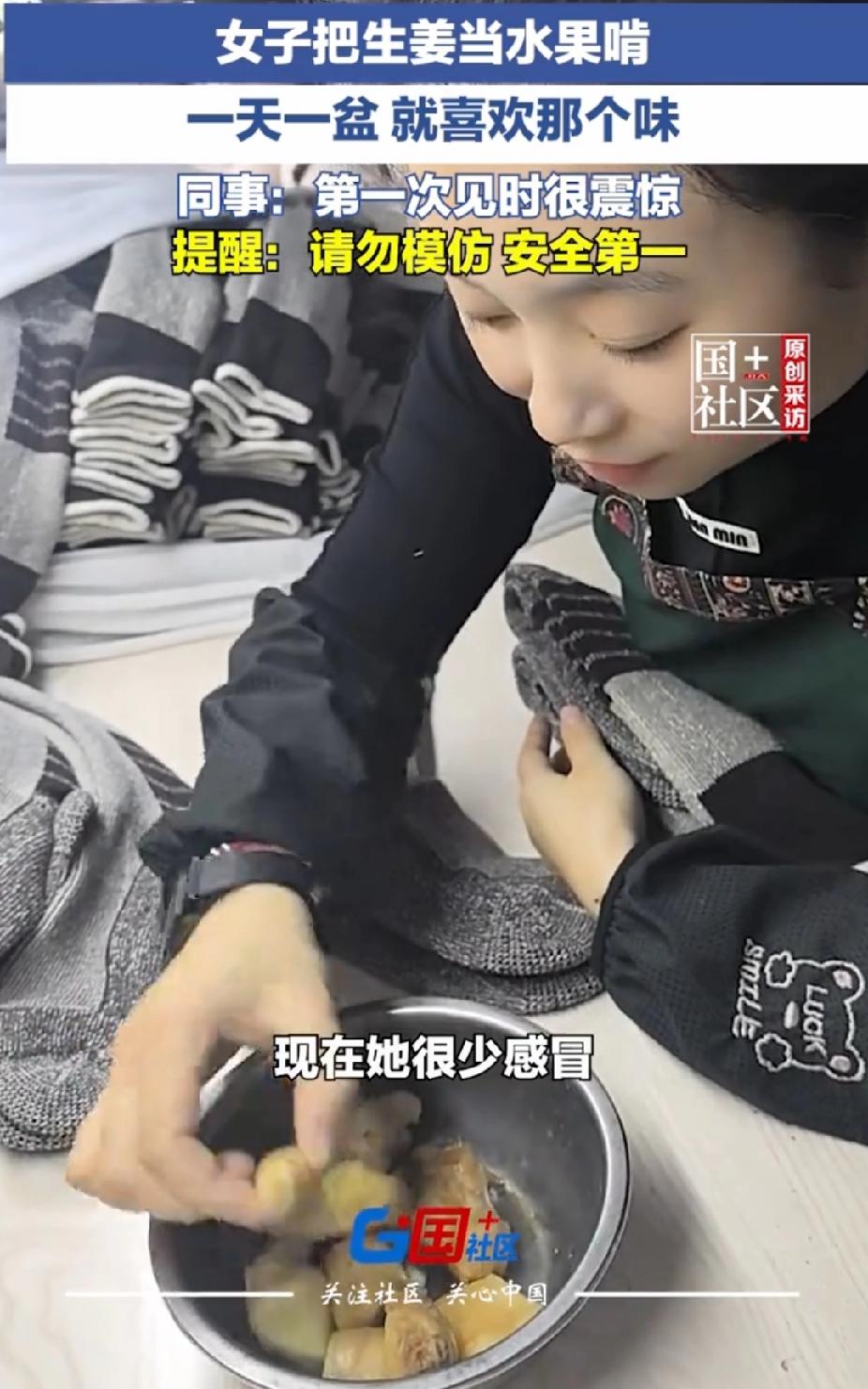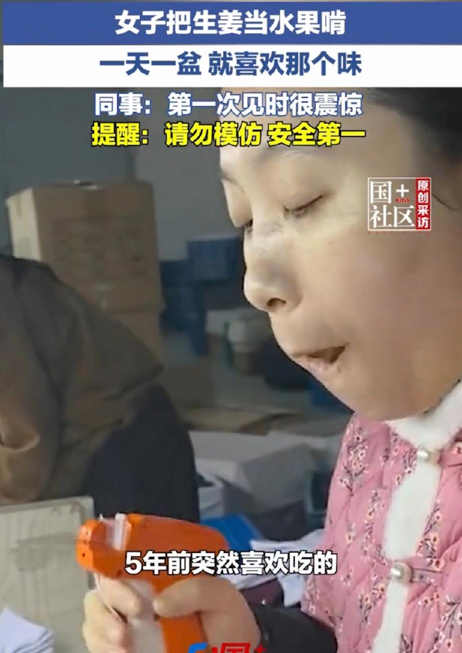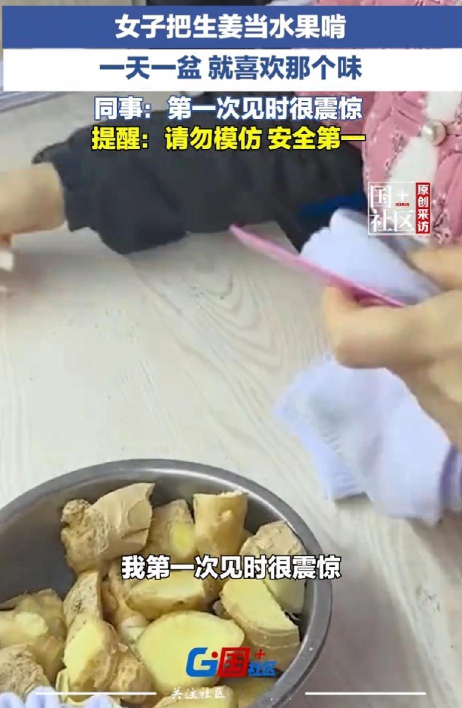 万万没想到!安徽蚌埠,女子将生姜当水果吃,一天一盆,大概1到2斤。女子的同事透露,女子是了5年前开始喜欢吃生姜的,喜欢生姜那个味道。现在很少感冒,但吃多了会上火。而同事第一次见女子这样吃生姜,同事也是十分震惊。 而网友们对此也有不同看法。 有网友说: “自从九十多岁的姥姥说她自己酷爱吃生姜之后,我就从心理上喜欢上了生姜。细心尝了一下,确实好好吃啊,但我顶多是看到炒菜的姜吃一下,单独吃一盆咱可搞不定。” 也有网友说: “这口味也太特别了!一般人吃生姜都受不了,她居然一天能吃一到两斤,还坚持了五年,这爱好属实是少见。” 还有网友说: “生姜吃多了伤胃,带皮吃会好点。但是也不能多吃。胃寒的人吃有奇效,但胃火大,胃有损伤的人不能吃。” 【个人观点】 一天一两斤生姜当水果吃?不止女子的同事都看傻了。说实话,我看了后,也挺震惊的。 我们都知道生姜确实是个好东西,像是平时炒菜会放几片,还有煮红糖姜水可以驱寒,或者感冒初期喝点姜汤,这些都是老辈传下来的智慧。 而像这位女子说她自己“很少感冒”,可能是跟长期吃姜确实有点关系——因为姜里的姜辣素能促进血液循环,发汗解表。 但是她吃这个量,一天一两斤?这就有点吓人了。 首先,生姜性温,少量吃有益,但是大量吃就是另一回事了。女子自己也发现她吃多了会上火,所以这可不是闹着玩的。 因为长期过量食用生姜,会容易口干舌燥、咽喉肿痛、便秘,严重的还可能刺激胃黏膜。 像有些体质偏热的人,几片姜下去就“火冒三丈”,更别说一斤了。 还有我在网上查了一下,生姜中含有一种叫姜黄素的成分,少量抗炎抗氧化,大量反而可能抑制血小板聚集。万一碰上需要手术或者凝血功能不好的人,麻烦就大了。 所以必须强调一句:千万别模仿! 其次,每个人的体质不一样,饮食习惯也不能这么极端。 每天两三片姜就够了,泡水、炒菜、炖汤都行。 最后,把生姜当水果吃,这已经不是养生了,是在跟自己过不去。健康饮食讲究的是均衡多样,不是靠“死磕”一种食材。 (信息来源: 国+社区) (个人观点,仅供参考,健康问题请咨询专业医生。)