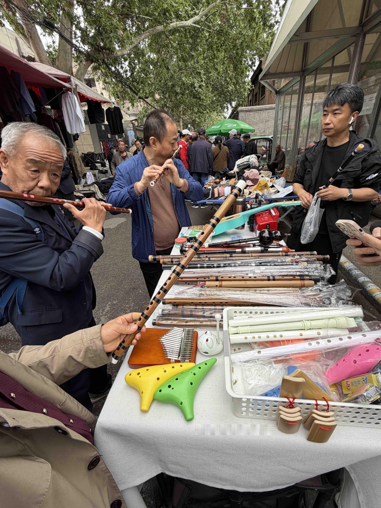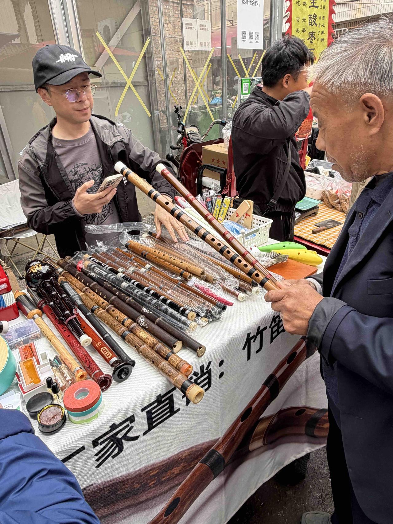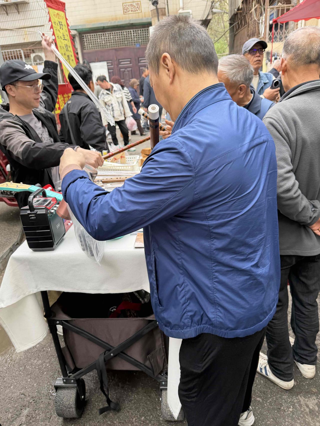上周日,我逛西安档子,在西仓西巷,看到售卖笛子的摊上,有几位爱好者在选购,就不由停下脚步,观看起来。 这家摊上的笛子还不少,有长有短,有粗有细,质量好的每个120元,一般的每个80元。 我小时候,学过吹笛子,可惜没有学会,半途而废,主要是笛子膜太贵,还是易耗品。 家里有个旧笛子,可我买不起笛子膜,只好作罢,不吹了! 摊上几位50、60后,拿着笛子在试吹,一看也是小时候学过,几十年没吹忘了,在摸索着找音调!