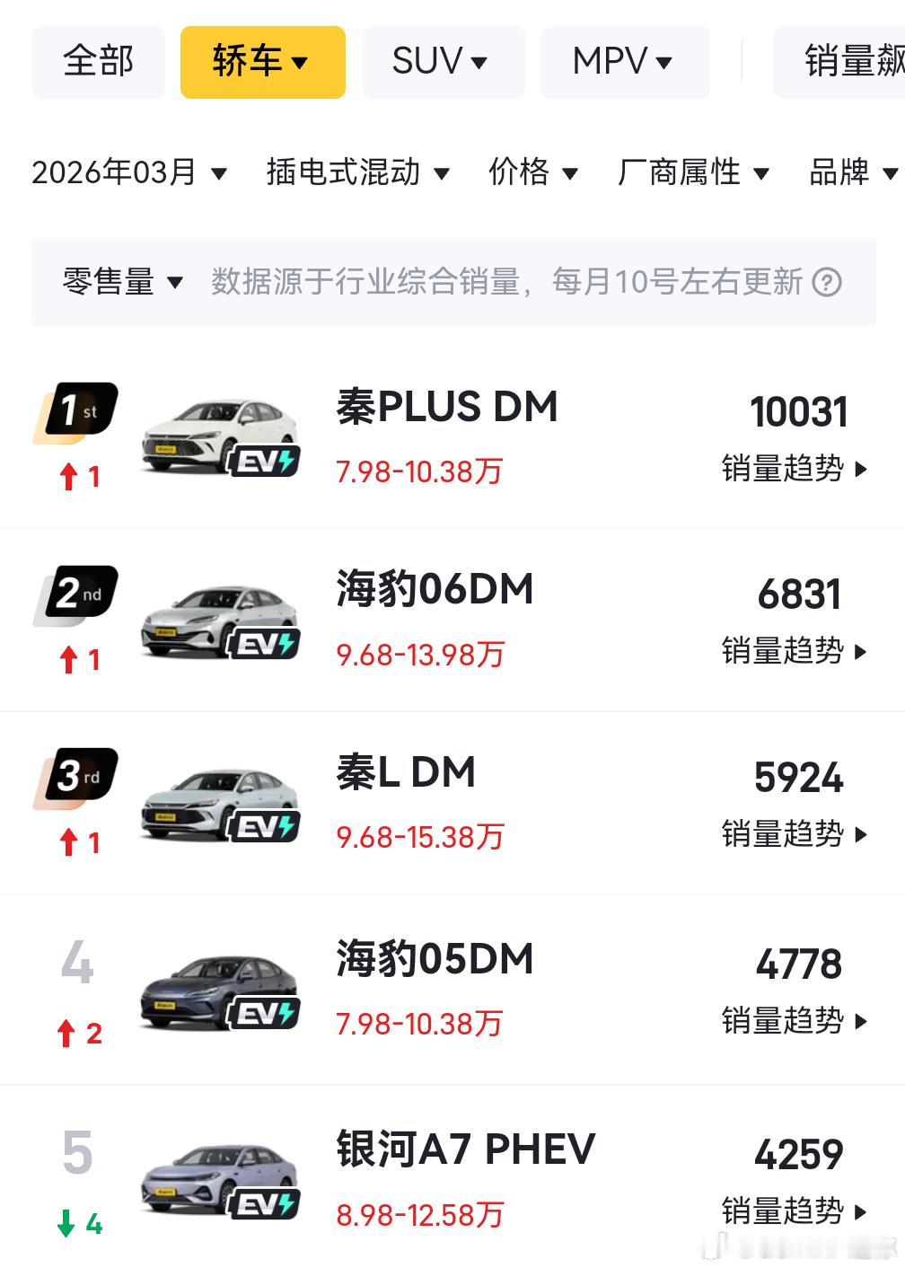 看了下3月份插混轿车销量,比亚迪4款车之下就是银河A7了,也是后起之秀