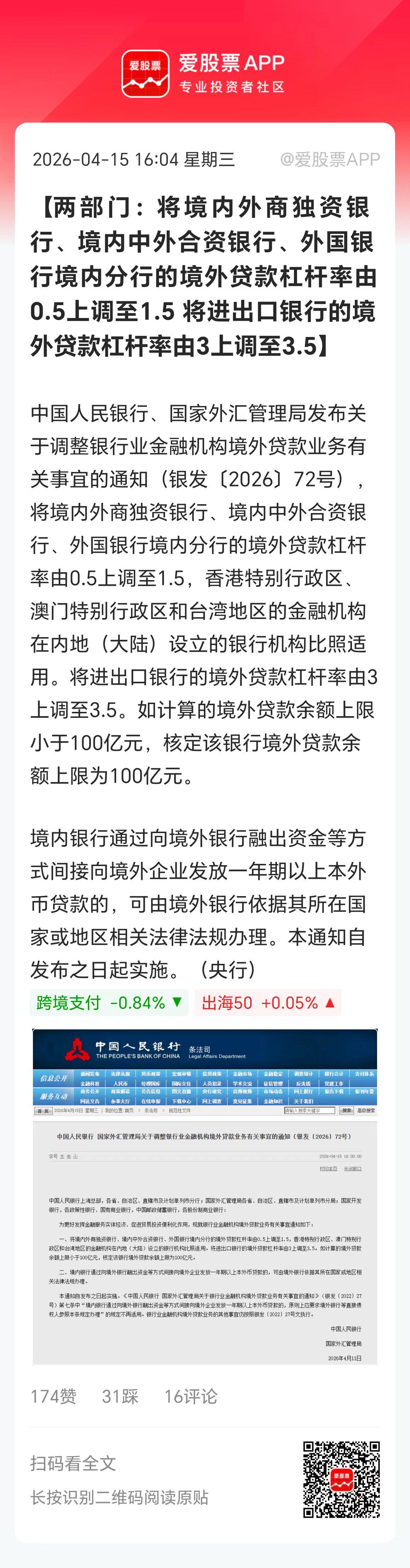 央行放大招了,将境内外资银行(含外商独资、中外合资及外国银行境内分行)的境外贷款杠杆率从0.5倍大幅上调至1.5倍,直接翻了3倍! 这个啥意思呢,就是放开银行给国外、境外借钱的额度,鼓励银行把钱投到海外去。 主要是的目的,一是支持中国企业出海,二是支持一带一路,三是给离岸人民币注入流动性!主要利好银行、一带一路(中国中车等)、高端制造(电动车等)这些方向。