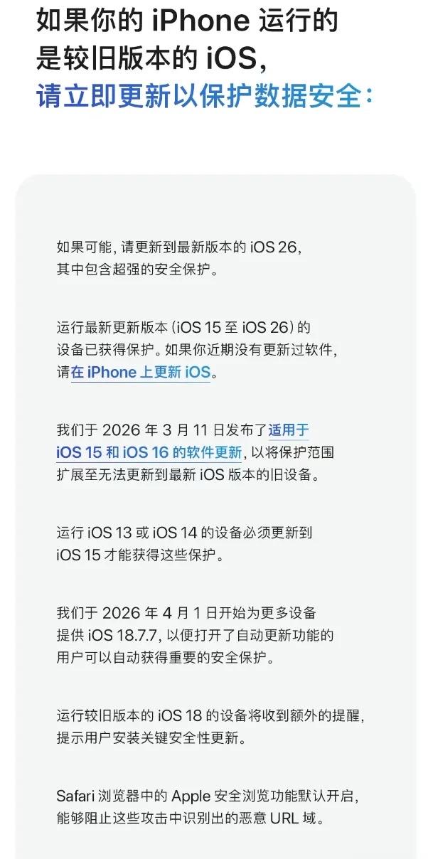 苹果紧急提醒:iPhone用户立即更新!你的手机可能正在"裸奔",2.8亿人已踩坑! 今早,苹果官微突然甩出红色紧急警报措辞前所未有的强硬:所有iPhone用户立刻更新系统! 不是优化流畅度,不是加新功能,而是你的手机正暴露在致命漏洞下,晚一步,隐私和钱袋子都可能不保! 工信部同步拉响最高级预警:境外黑客团伙正利用"暗剑"漏洞(CVE-2026-20643)疯狂攻击国内用户。这个漏洞藏在iOS最底层的浏览器内核,无需你授权、不用你输密码,只要点开一条群链接、看一个公众号网页、刷一条带广告的短视频,黑客就能瞬间远程接管你的手机! 你的相册、通讯录、聊天记录会被看光光;支付密码、银行卡信息、短信验证码全被偷走;甚至能偷偷打开摄像头、麦克风,实时监控你的一举一动。更可怕的是,这不是未来威胁,已有超千万台iPhone中招,国内2.8亿台设备还在风险区,只要还停留在iOS13.0—17.2.1全系列中招! 多少人还在犯傻:更新提示弹出来就点"稍后",怕新系统卡、怕耗电快、怕数据丢失。但你知道吗?老系统才是定时炸弹! 黑客日夜盯着这些漏洞,你的"懒得更",就是给小偷留着大门。有人刷个朋友圈被盗刷几万,有人点个链接被锁机勒索,有人全家照被泄露威胁——这些悲剧,本可以一个更新就避免! 苹果这次是真急了:不仅推最新iOS26.4.1安全版,还给老机型专门发了iOS18.7.7补丁,不更功能只堵漏洞。哪怕你是iPhone8、X这些老设备,也能安全升级。 别再侥幸!现在立刻打开设置—通用—软件更新,连上WiFi、充上电,5分钟更新,换一辈子安心。已经更完的,评论区报个平安;还没更的,别拖了!转发给用iPhone的家人朋友,别让你的疏忽,酿成无法挽回的损失!安全这件事从来没有"下次再说"!