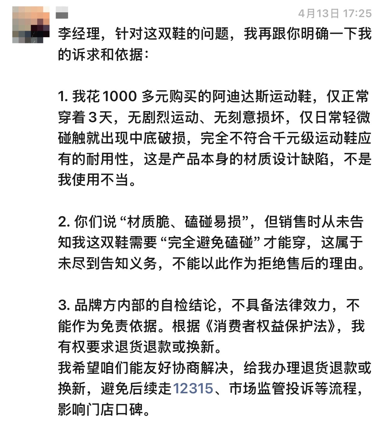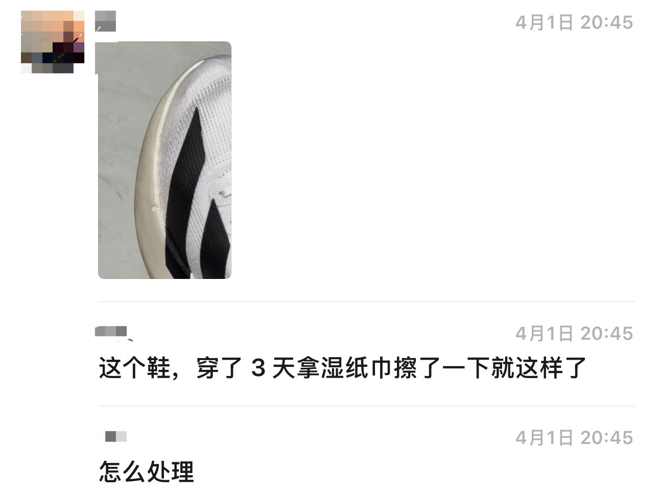 刚刚朋友拿他手机给我看,叫我吃瓜,说群里有个人在维权:鞋子穿了三天,说用湿纸巾擦一下就这样了,要求退货退款或者换新。