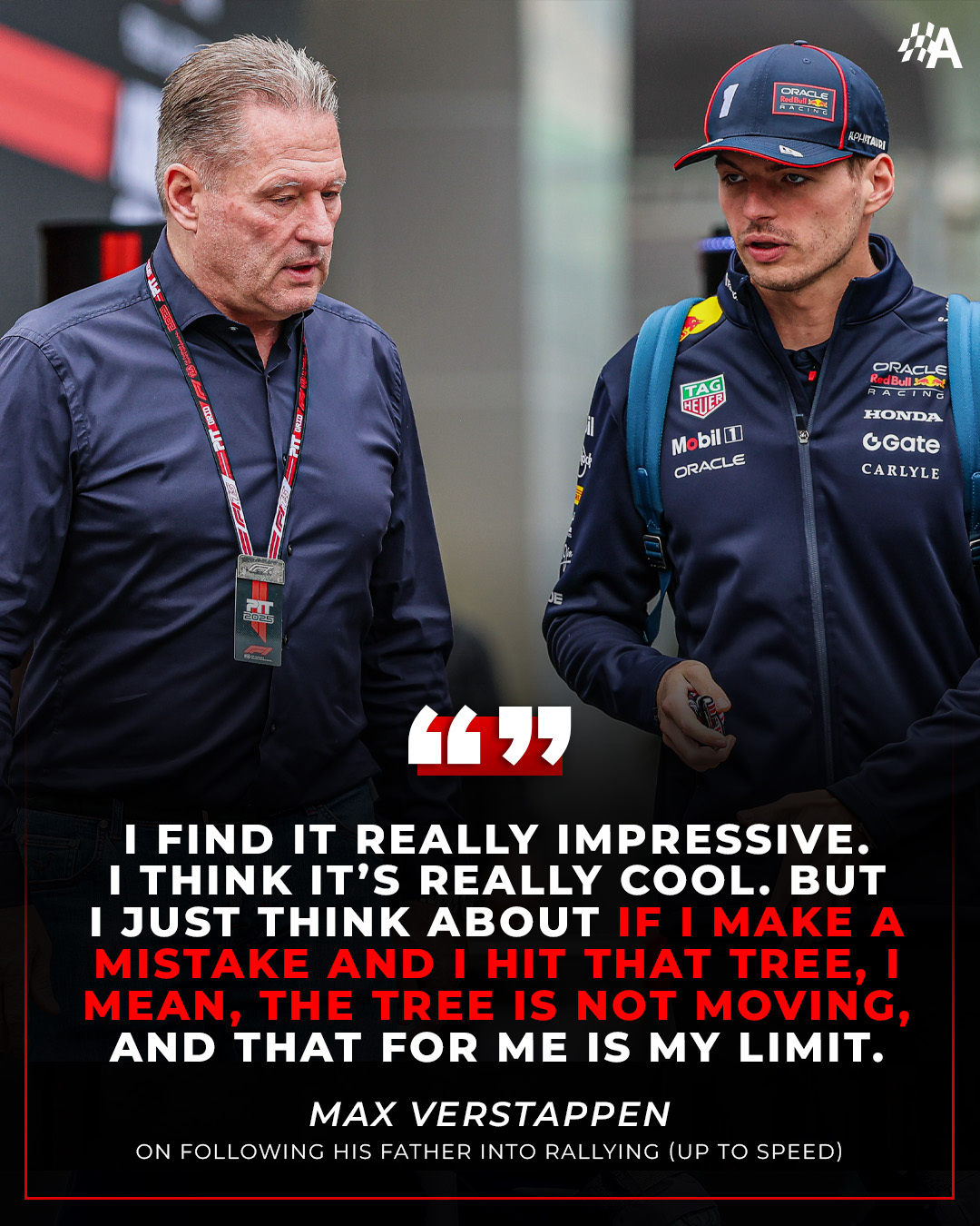 老维斯塔潘邀请儿子Max尝试拉力赛“Max早晚得来体验一次”路边的树木、障碍就摆在那里,但你没必要过分在意。也许只要他亲身试过,看法一定会彻底改变