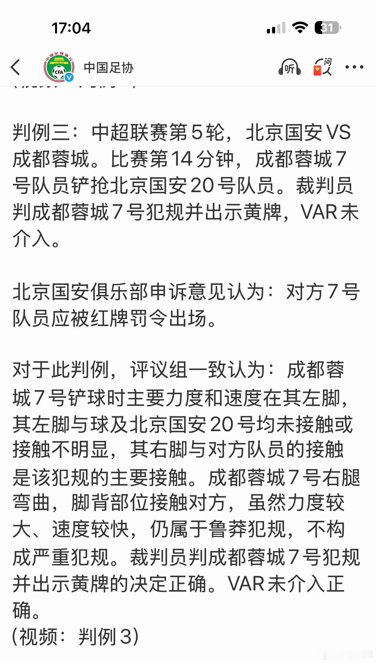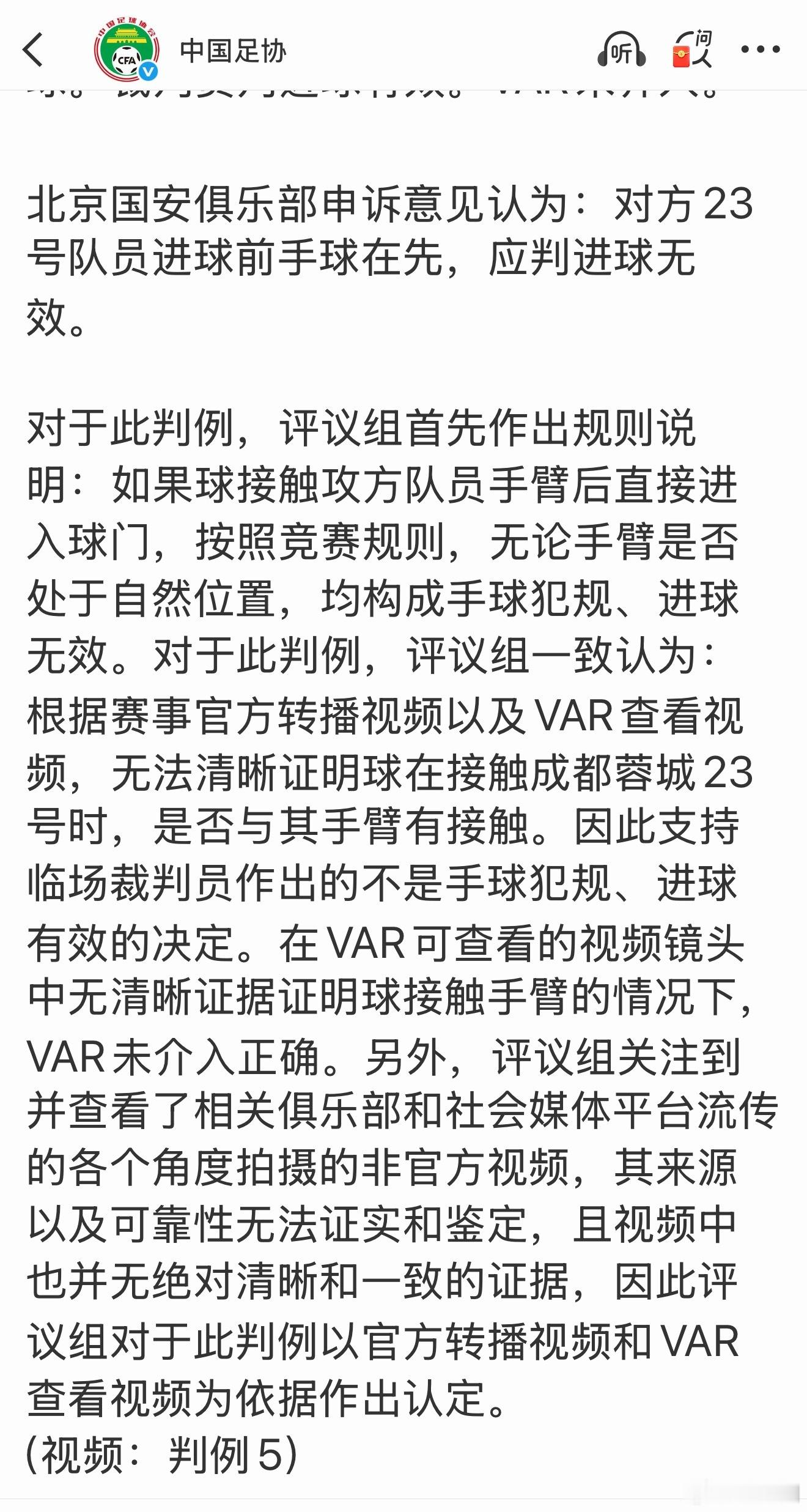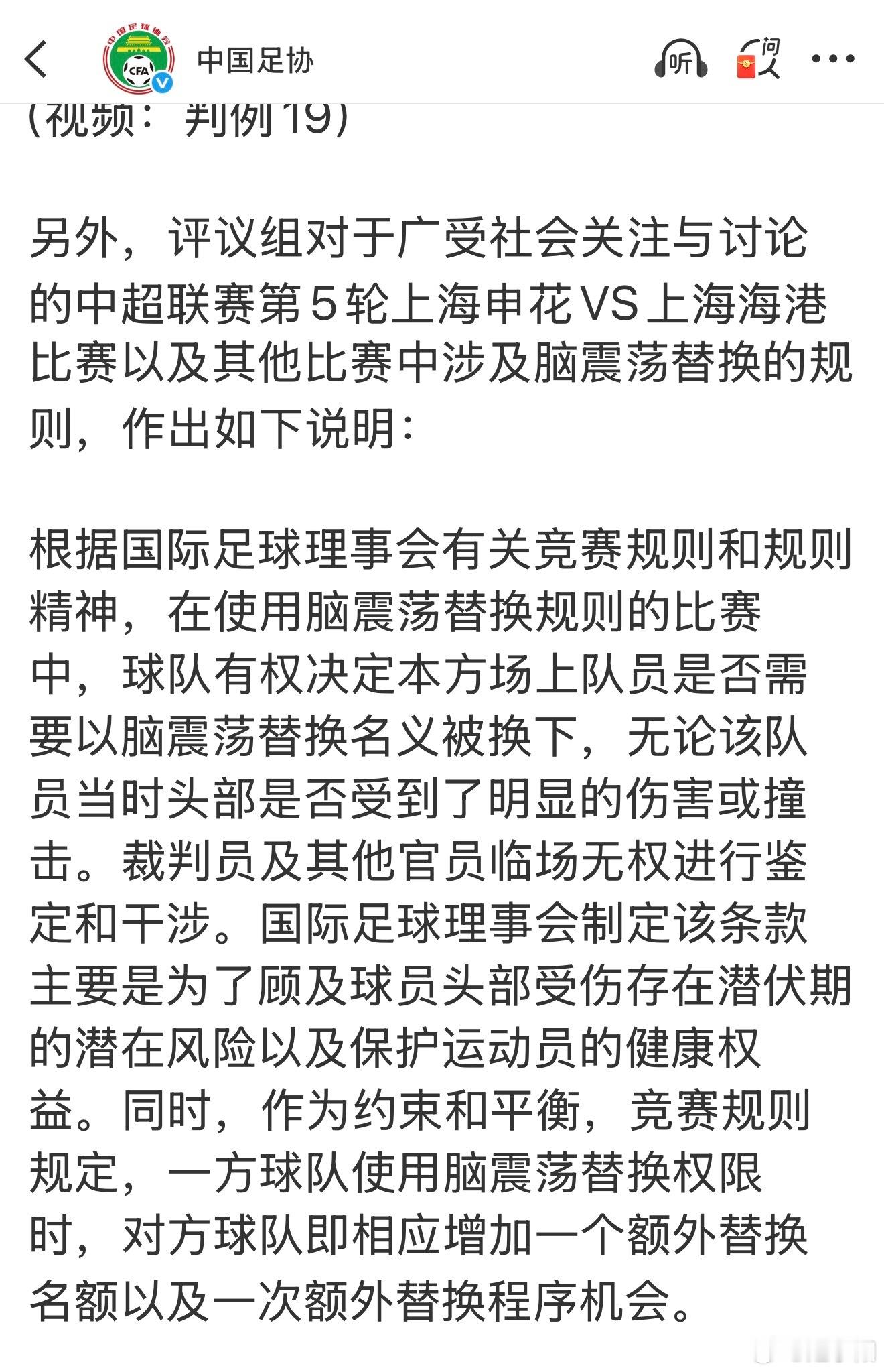 最新一期足协裁判评议,结论之一:韦世豪那个够不上红牌。结论之二:根据赛事转播视频和VAR 查看视频,无法清晰证明球是否与手臂有接触。关于上海德比战三次换人之后的第四次换人,本期评议中也对脑震荡替换规则做了解释。相关规则解释,基本和之前微博里介绍的差不多。 网页链接