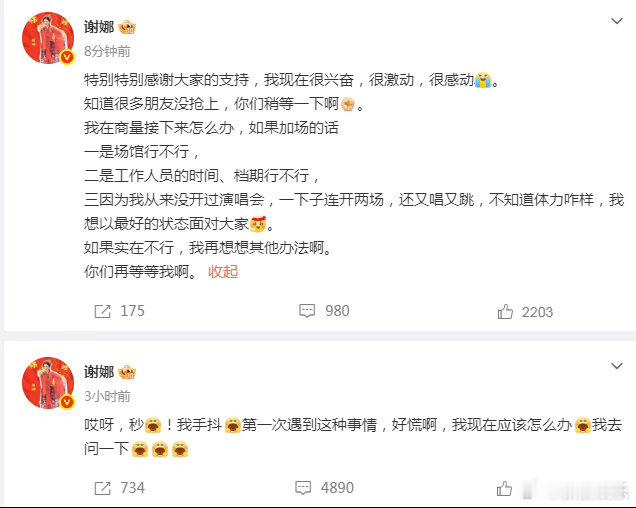 谢娜说会想办法加场 发文回应演唱会秒售罄:“特别特别感谢大家的支持我现在很兴奋,很激动,很感动。知道很多朋友没抢上,你们稍等一下啊。”并透露正在考虑加场的问题,会尽力想想其他办法。期待娜姐!