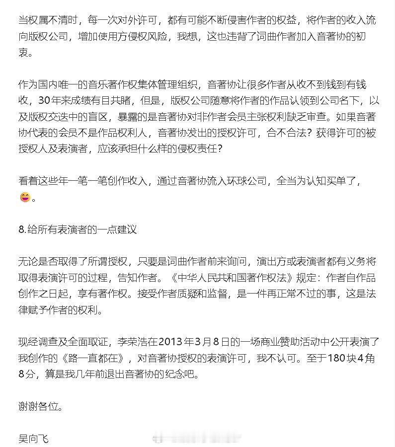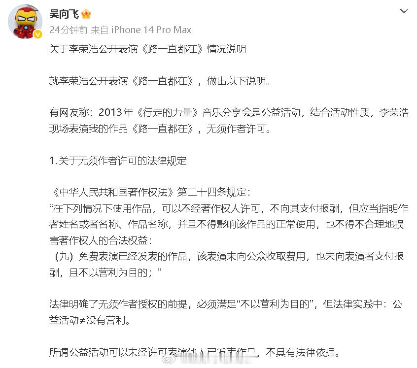 吴向飞发李荣浩相关情况说明 吴向飞再发长文⬇️