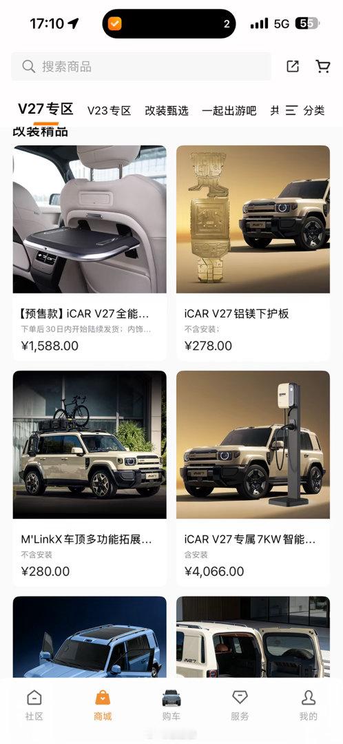 虽然我的icar v27还在排产,但我已经在研究商城配件了天啊!我没想到会这么玲琅满目,车顶平台、侧梯这些都是常规操作啦~主要是连小桌板、电吸门、电尾门、后排娱乐屏这些都可以无损升级,直接往里加配置,品类太齐全,这车太能玩了!!袁启俊的V27