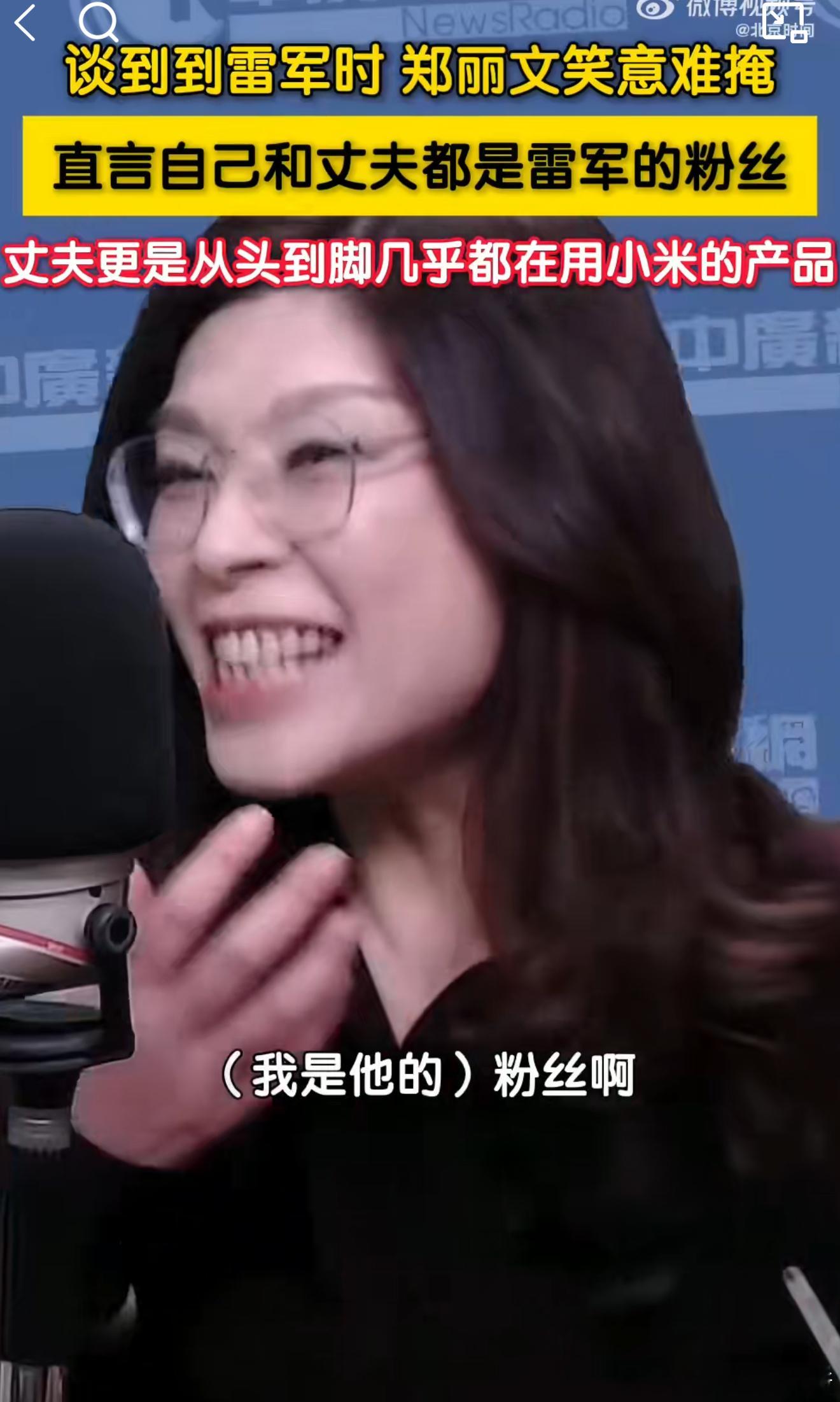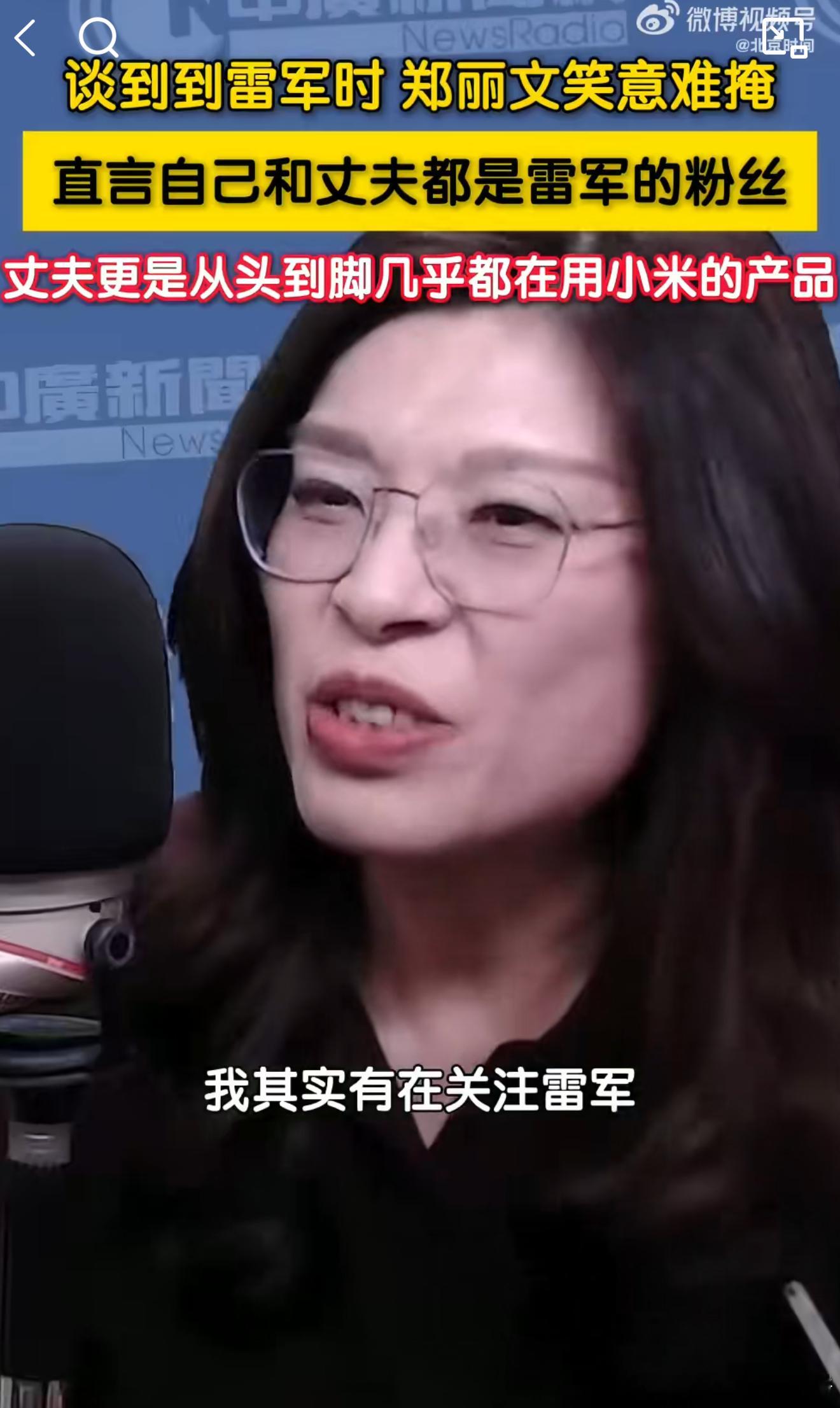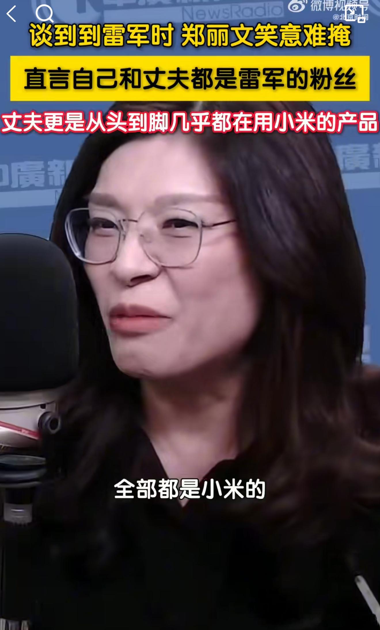 郑丽文直言是雷军粉丝 郑丽文聊起雷总直接笑到藏不住,还说自己和老公都是雷军的粉丝,老公更是从头到脚几乎全用小米的产品。