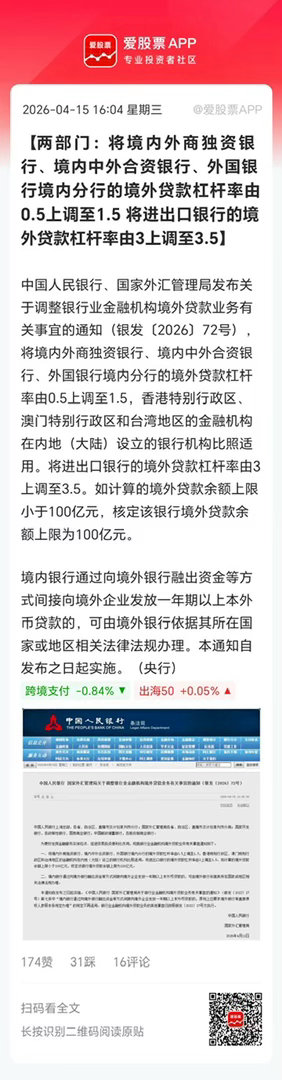这个啥意思呢,就是放开银行给国外、境外借钱的额度,鼓励银行把钱投到海外去。