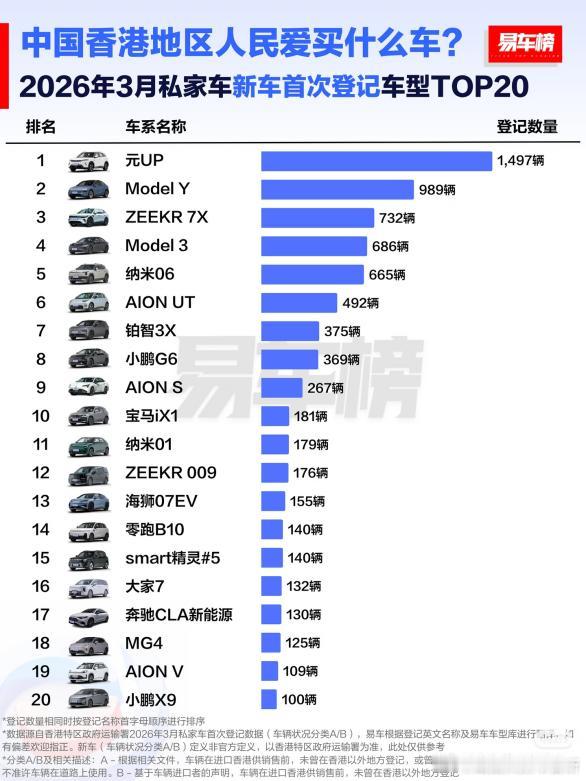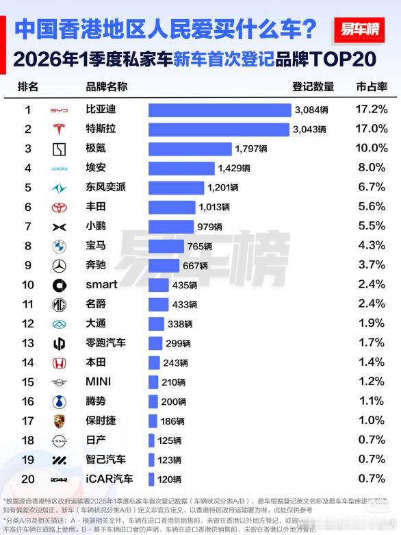 比亚迪在香港是真的火出圈了,2026 年一季度,不管是品牌总销量还是单车型销量,比亚迪都是第一。3 月单月卖了 1700 多台,直接超过特斯拉,彰显双料冠军非凡实力。