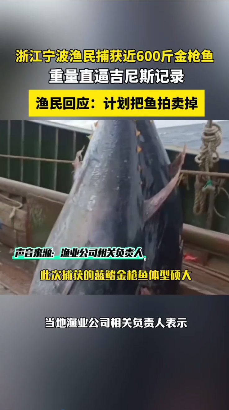 渔民回应又捕获近600斤重金枪鱼渔民捕获近600斤金枪鱼上架拍卖 东海再迎巨型蓝鳍金枪鱼,近600斤重的巨物,是生态变好的最好信号。