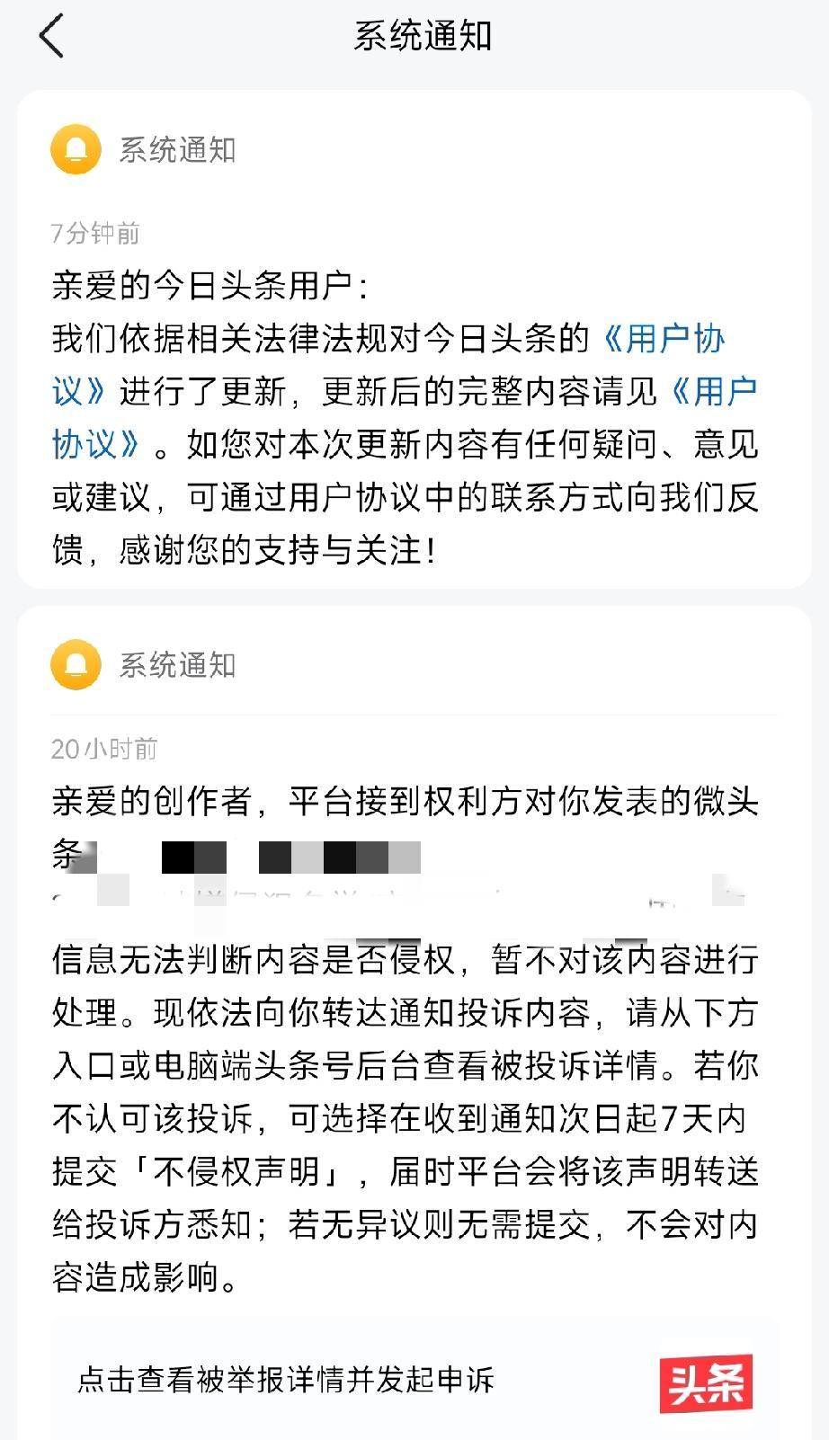 懂的人快来! 今日头条这条系统消息你们收到了? 说是更新了协议。 头条里的老师大神们快来帮忙看看, 这是因为我昨天的发文有点问题才发给我的还是每个人都有。 有问题的微头条已删除了, 怎么又突然改了协议! 实在是太长了[捂脸] 懂的分享一下[作揖]