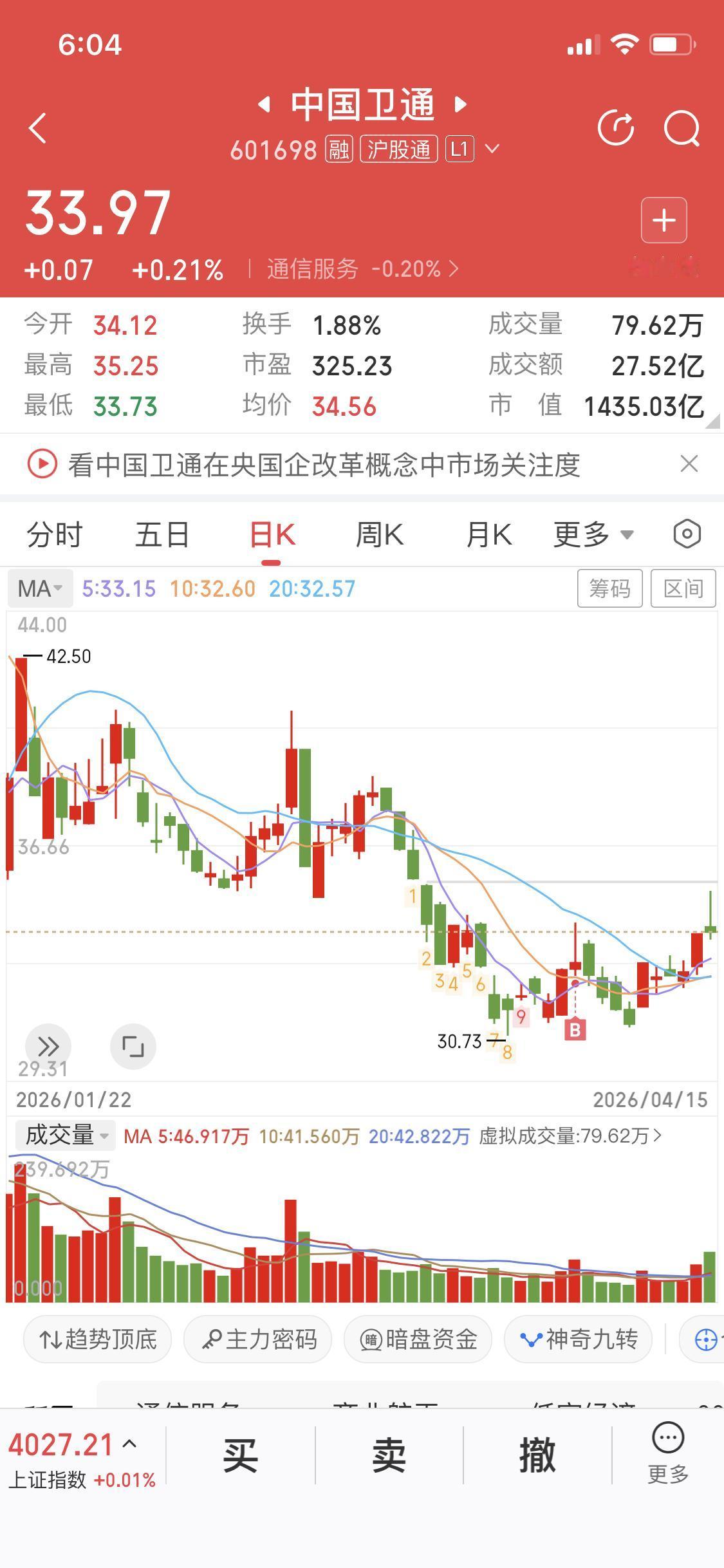 今天中国卫通收一根上引线 行情结束了吗 我只把它当作试盘线 目前我已经浮盈了 稳稳拿好 中国卫通上方抛压有的 这不代表不会拉升 主力试探几次之后 猛然拉升[笑哭]