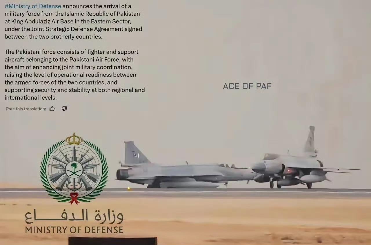 部署到沙特东部省阿卜杜勒-阿齐兹国王空军基地的巴基斯坦空军飞机,停机坪上能清楚看到10架JF-17C"枭龙"战斗机和2架伊尔-78MP加油机。JF-17C战斗机挂载PL-10E和PL-15E空空导弹后,空战能力是很强的。 此次部署是依据2025年沙特与巴基斯坦签署的《联合战略防务协议》进行的长期协同行动,旨在提升地区防御能力与军事协作水平。 此次部署标志着巴基斯坦首次成建制、带完整作战体系(战斗机+预警机+加油机+运输机)实施海外军事存在,具有重要战略意义。同时,沙特通过此举强化自主安全架构,减少对美国主导防务体系的依赖,推动中东安全格局多元化