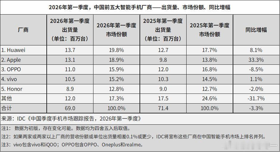 2026年一季度中国大陆智能手机市场份额小米数码手机苹果华为手机