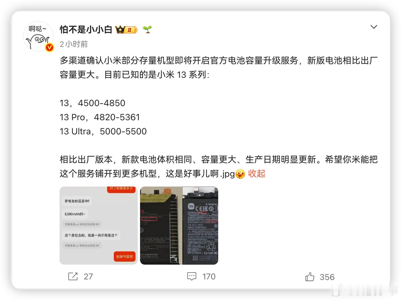 传闻说 13 系列都有,但我看了下官网,目前就只有小米 13 Ultra 上线了这个「电池升级」的选项,其它两款估计要等等看。