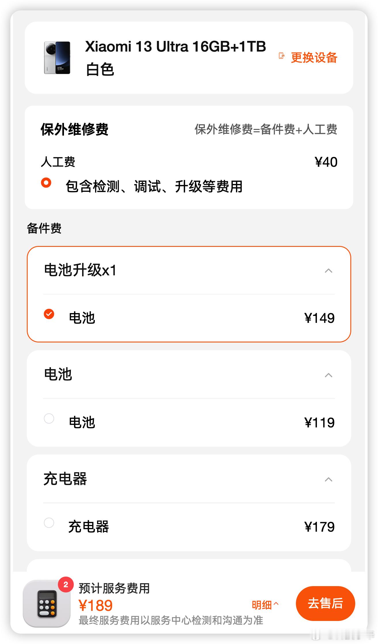 看来传闻是真的啊,小米 13 Ultra 已经上线了「电池升级」服务,普通换电池是 ¥119,升级电池是 ¥149 ,手工费统一是 ¥40 。