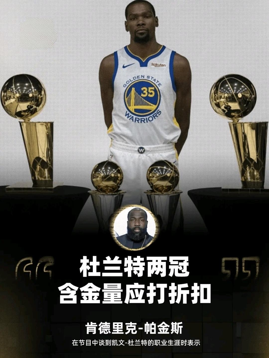 2冠2FMVP白拿了?帕金斯直言杜兰特只能排历史20左右,真的合理吗? 【合理🙋♀️】 1、两座总冠军皆来源于金州勇士,而勇士对的核心不是杜兰特。 2、追梦那句话现在看来杀人诛心(你没来我们就是冠军),后续的发展更令人想不到,杜兰特走后勇士再夺总冠军;如此一来杜兰特对于勇士的重要性大幅下降。 3、季后赛关机键时刻宕机,雷霆西决被勇士逆转、总决赛天王山之战表现低迷,关键时刻表现不及乔丹、科比。 4、伤病导致巅峰不如同一时代的詹姆斯,出勤率和健康状态惹人质疑。 【不合理💀】 1、历史顶级的得分能力,相较于科比、安东尼、库里等人来说,杜兰特的得分能力堪称误解,且效率惊人。 2、跨越时代的适配性;杜兰特的身高臂展放到任何时代都是错位单打的存在,让对手胆寒的存在。 3、别人忽视的防守能力,堪称攻防一体;尽管没有入选最佳防守阵容;但无论是在雷霆、勇士、篮网、火箭,杜兰特都一定程度上负责了对方的高大球员,他的防守能力不容忽视。 ❓问题来了:“杜兰特历史地位到底排在哪个档位比较合理?” 1、1-5 2、6-10 3、11-15 4、16-20