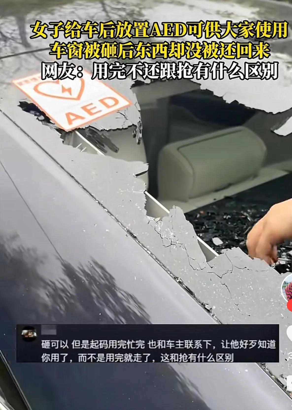 人家说不用你赔也许是客套话,不该真不赔! 女子把AED放后车窗,玻璃被砸碎,还不用人家赔钱,真是心地善良。 幸好好人有好报,上汽通用准备送她一副玻璃和新的AED。 不过有的视频里说,AED被拿走以后,没还回来,不知道是不是真的,真是这样的话,我觉得有点不厚道了,正常有家教的人,车主说不用你赔,你就算砸锅卖铁也要赔,毕竟人家救了你一命!何况别克的车玻璃也不贵,几千块顶天了,大家评评理,说是不是?
