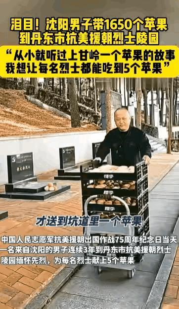 “看哭了!”沈阳,一47岁男子扛着1650个苹果,独自驱车赶到丹东烈士陵园,然后一个墓碑一个墓碑地走过去,每个碑前整整齐齐摆上5个苹果,就为了圆一个埋在心底多年的念想——当年上甘岭,8个战士才分到一个苹果,现在,他要让每位烈士都吃上5个。 说实话,读这条新闻的时候,我的眼泪止不住就流下来了。 这个姓支的大哥来自沈阳辽中区,今年47岁。他做的事其实特别简单,却又沉重得让人喘不过气来。从2023年开始,每到抗美援朝纪念日前后,他就雷打不动地拉着苹果往烈士陵园跑。 他先去了沈阳抗美援朝烈士陵园,那里有324位烈士,每人5个,一共1620个。第二天又赶到丹东,陵园里330位烈士,每人5个,又是1650个苹果。 两个陵园,六百多位烈士,他一个一个墓碑走过去,一个一个地摆放。 很多人可能不理解,为什么偏偏是苹果?为什么要送5个?这得从七十多年前上甘岭那条坑道说起。 1952年10月,上甘岭战役打到了最惨烈的时候。时任15军45师135团7连连长的张计发,带着160多人的队伍冲上去,最后全连只剩下8个人,硬是死守住了阵地。比牺牲更折磨人的是缺水。坑道里的步话机员嗓子干哑得说不出话,就用手打自己的嘴巴,打出点血来润喉咙,好保证能和上级联系上。 后方部队想尽办法往坑道里送物资,15军紧急采购了8万斤苹果,可敌人的炮火把上山的路完全封锁了,大部分运输人员都牺牲在封锁线上。 最后,只有一个苹果,是运输员刘明生在途中捡到的,被带进了张计发的坑道。连长张计发自己舍不得吃,把苹果递给战士,战士又递给伤员,伤员又递回来。一圈传完了,苹果还是完整的。张计发没办法,只好用激将法:“这么多人,连一个苹果都消灭不掉,怎么打敌人?”说完他自己先咬了一点点皮,传给其他人。就这样,8个人一点点分着,把这个苹果吃完了。 七十多年后,支晓刚带着家乡的沈阳寒富苹果来了。当年8个战士分一个苹果,今天每个烈士面前都摆着5个。他说自己从小听上甘岭的故事,心里一直记着,现在日子好了,就想让烈士们尝尝新时代的甜头。 他的女儿说,父亲从小给她讲抗美援朝的故事,一直想让她参军,她没当成兵,就帮着送苹果来纪念先烈。在深圳工作的侄女,这次听说后也主动加入,“虽然我是第一次参加,但内心很有触动,以后每年我都想让他们吃到沈阳的大苹果”。 一家三代人,用最朴素的方式,完成了一场跨越时空的对话。 抗美援朝战争中牺牲的志愿军烈士有19万多人,安葬在丹东市的烈士有2000余名。丹东全市共有11处集中安葬抗美援朝烈士的陵园,安葬烈士3500余位。 1951年,中国人民志愿军第50军在丹东锦江山北麓亲手修建了这座陵园,这是最早的志愿军烈士陵园之一。他们修建这座陵园的时候,可曾想过,七十多年后,会有一个沈阳汉子,拉着一车红彤彤的苹果,来到这里? 我曾去过一些烈士陵园。一排排墓碑安安静静地立在那里,上面刻着名字、籍贯、牺牲时的年龄。很多人才二十出头,正是最鲜活的年纪。每年都有普通人自发前往祭扫。2025年4月,丹东志愿者团队开展“我替志愿军烈士亲属去扫墓”活动,200多人参与,已经连续做了好多年。2024年11月,第十一批在韩志愿军烈士遗骸回国时,有军属特意带着苹果在陵园门口等待,说“苹果管够,我们不会忘记这段历史”。 这一个个普通人,在用最真诚的方式告诉那些长眠于此的年轻人——我们没有忘记你们。 支大哥的行为不是什么惊天动地的大事,他没有捐多少钱,也没有做什么了不起的壮举。他做的就是搬运、摆放、跪下、起身,重复几百次。可正是这种重复,让人看到了信念的份量。1650个苹果,330座墓碑,一个普通人用最笨拙、最实在的方式,把七十多年前那个苹果欠下的账,一笔一笔地还上了。 各位读者你们怎么看?欢迎在评论区讨论。